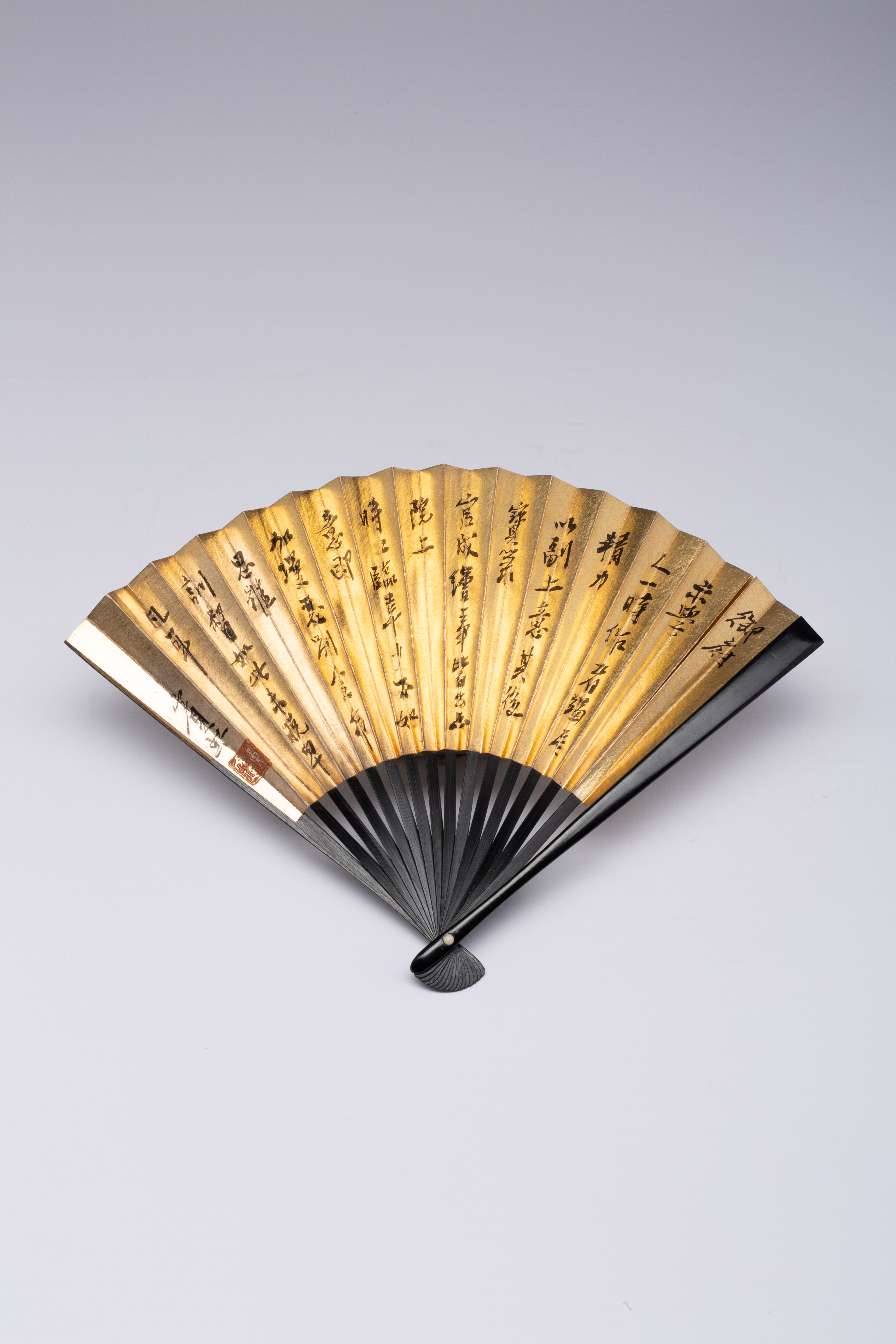 A Chinese painting on a folding fan, ink on gold paper, inscribed and signed both sides with artist's seals which read Huang Binhong, 31cm wide.