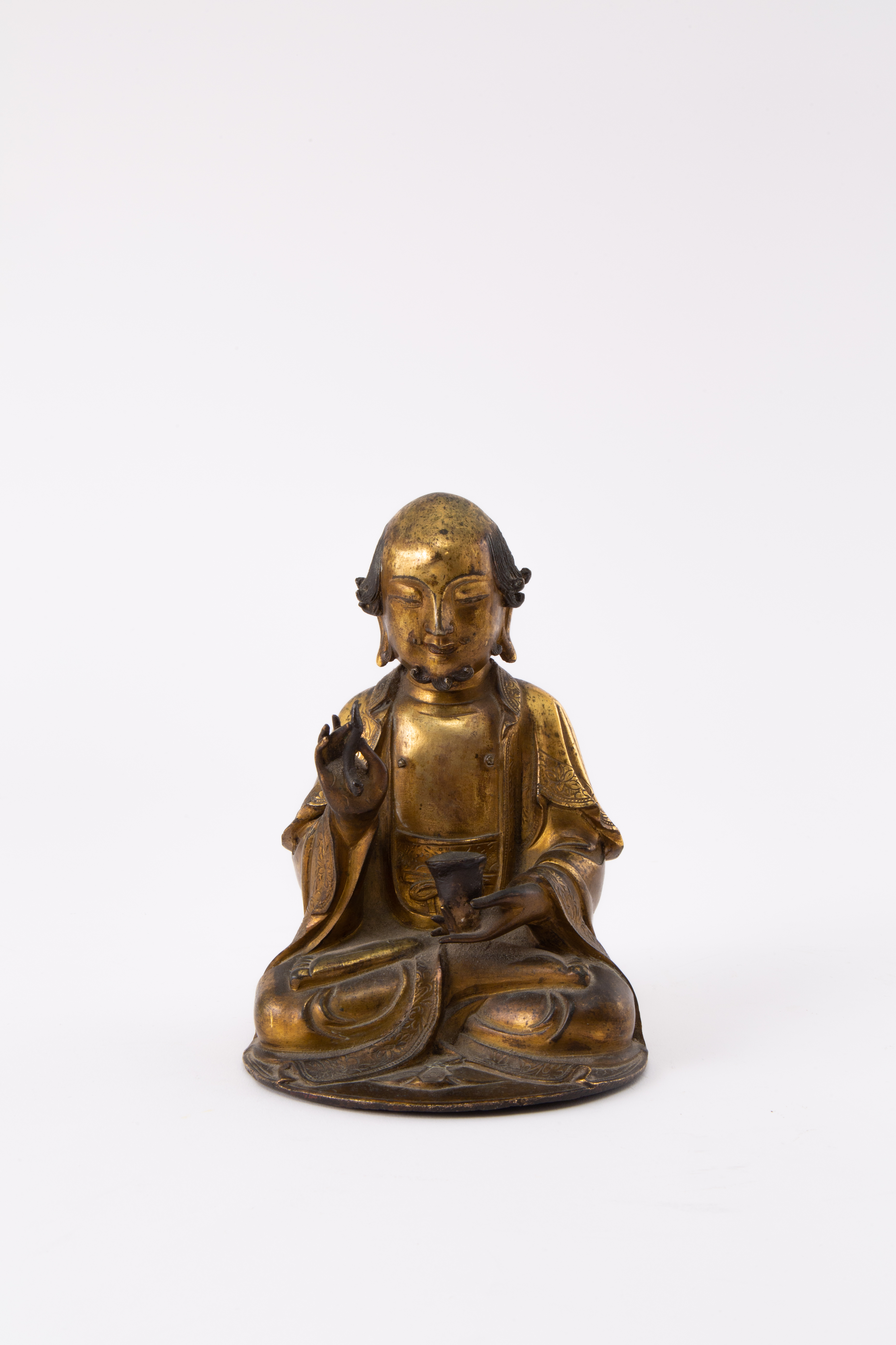 The luohan seated in dhyanasana, with his right hand held in shuni mudra, the left hand supporting a vase, dressed in a loosely fitting shawl and dhoti detailed with floral scroll borders, his head framed by elongated earlobes, curly hair and a beard, 1.96kg,17.5cm.