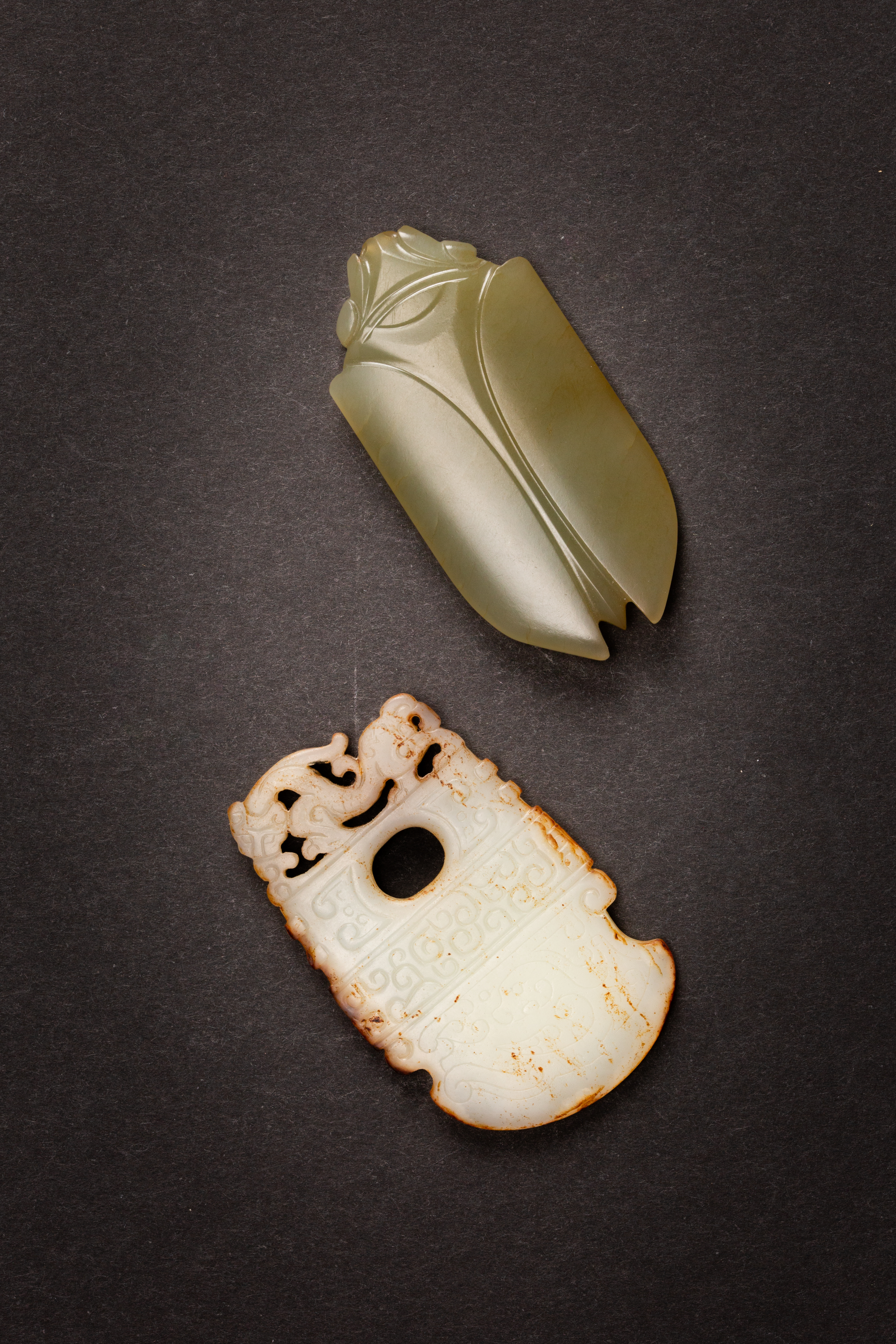 The flattened celadon jade cicada of an even tone; the other an archaistic axe-shaped pendant, the shaft surmounted by a sinuous chilong, the rounded blade incised with kui dragons and stylised scrolls, the pale stone with feathery russet markings, 6cm and 5.9cm. (2)