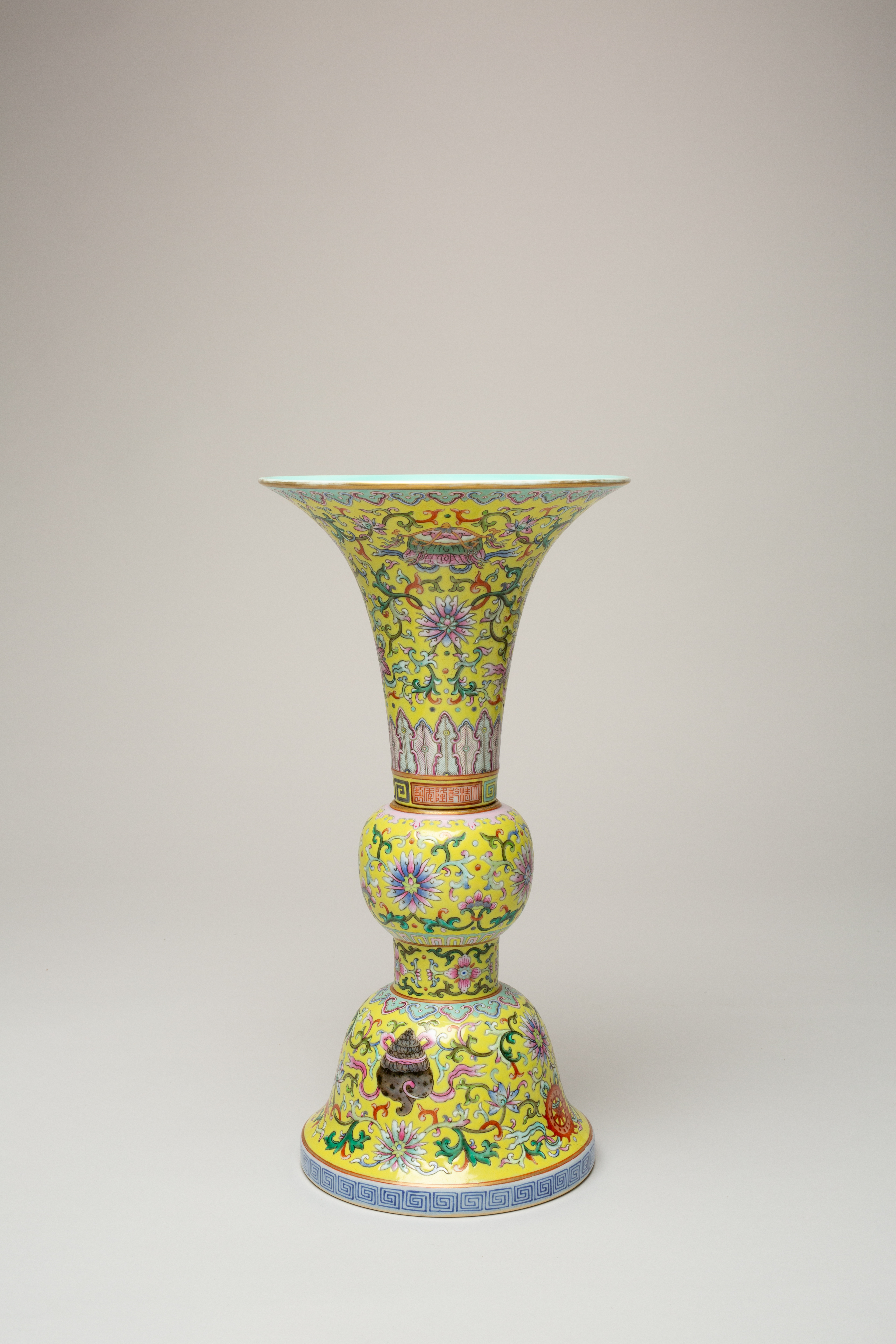 The exterior decorated with lotus flowers and scrolling foliage, the design incorporating the baijixiang, the interior and base turquoise, 36.5cm.