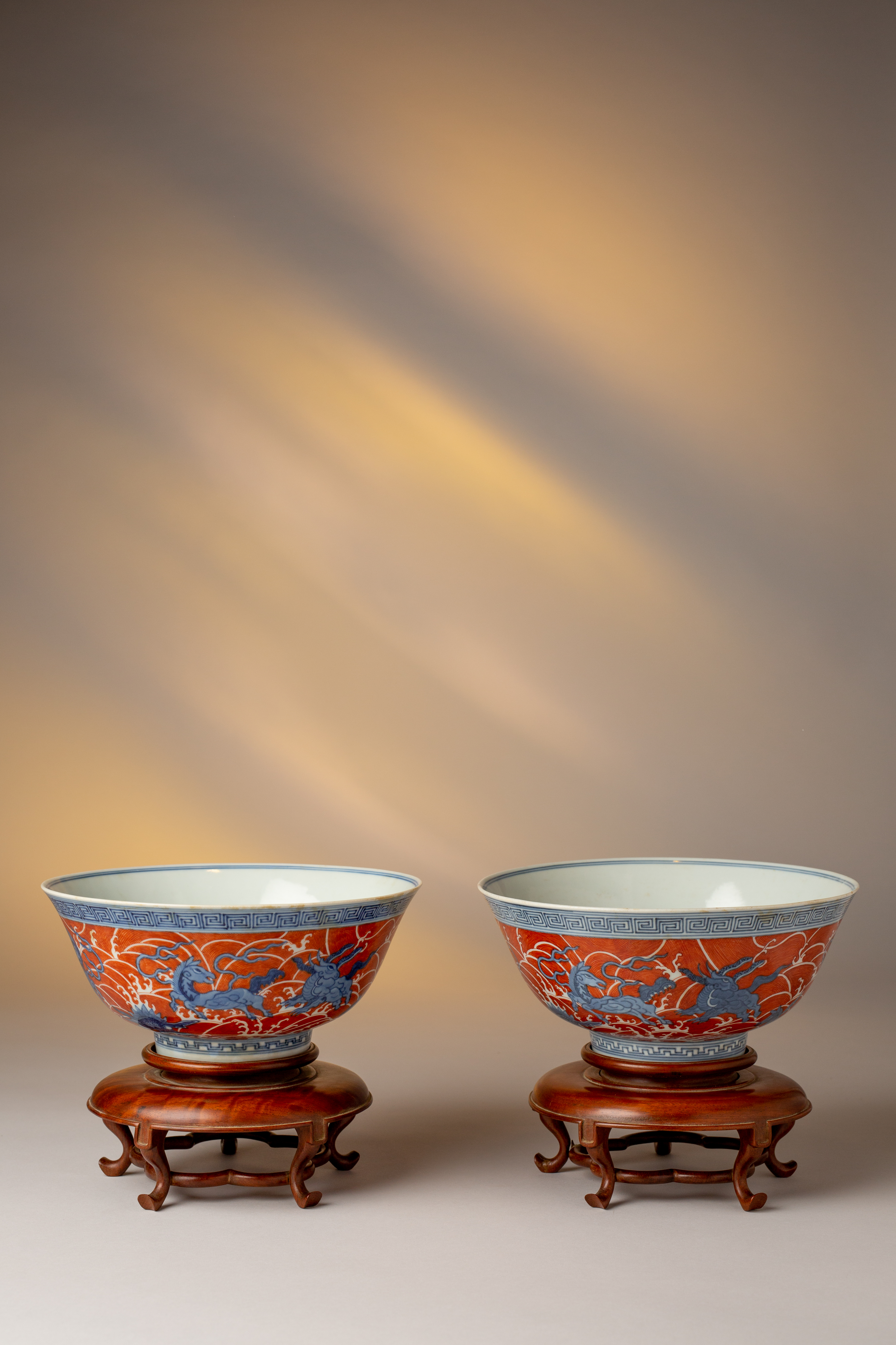 A PAIR OF RARE CHINESE IMPERIAL IRON-RED DECORATED AND UNDERGLAZE BLUE 'SEA CREATURES' BOWLS