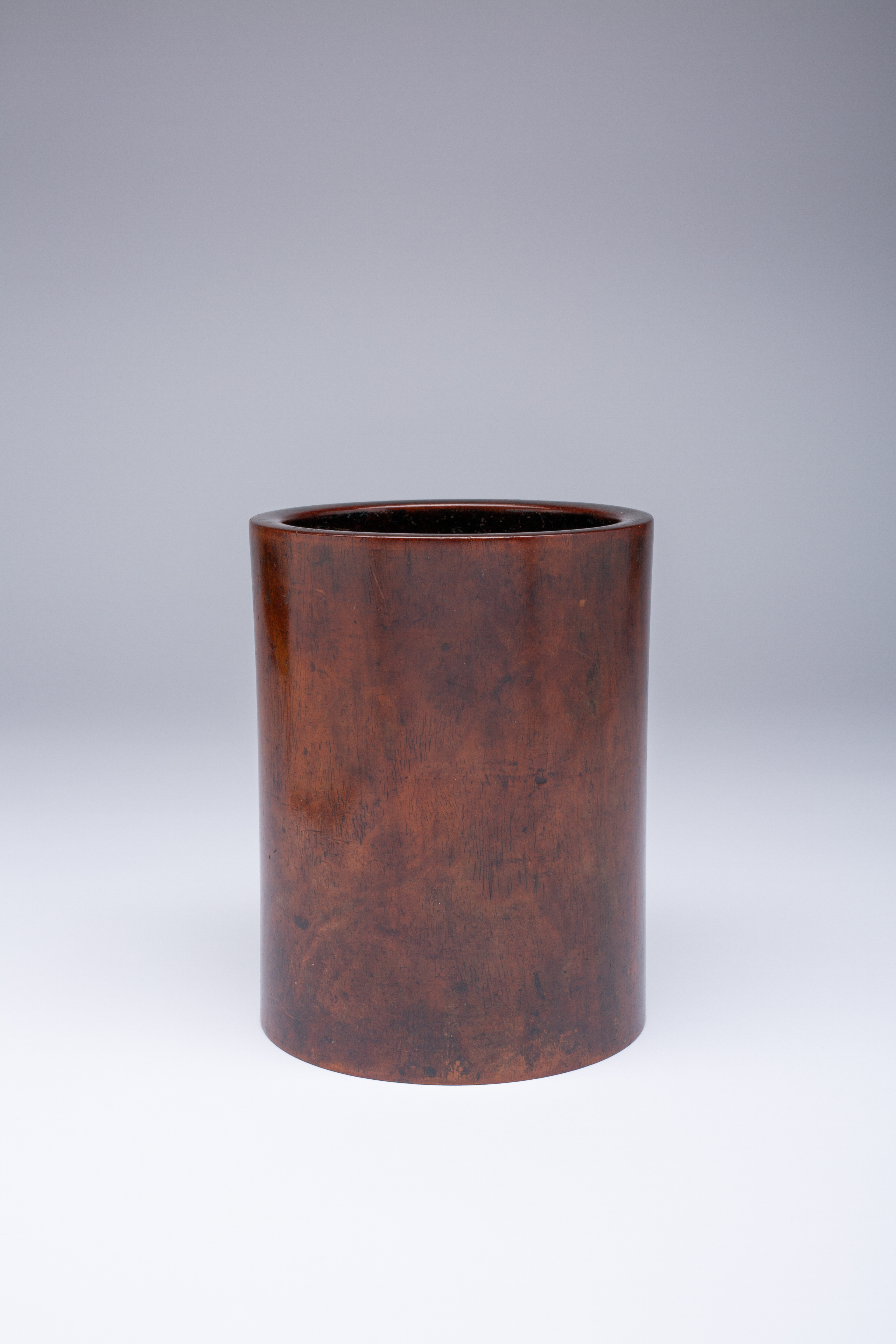 The cylindrical slightly waisted body with a warm chestnut patina, the base with a recessed plug, 16cm.