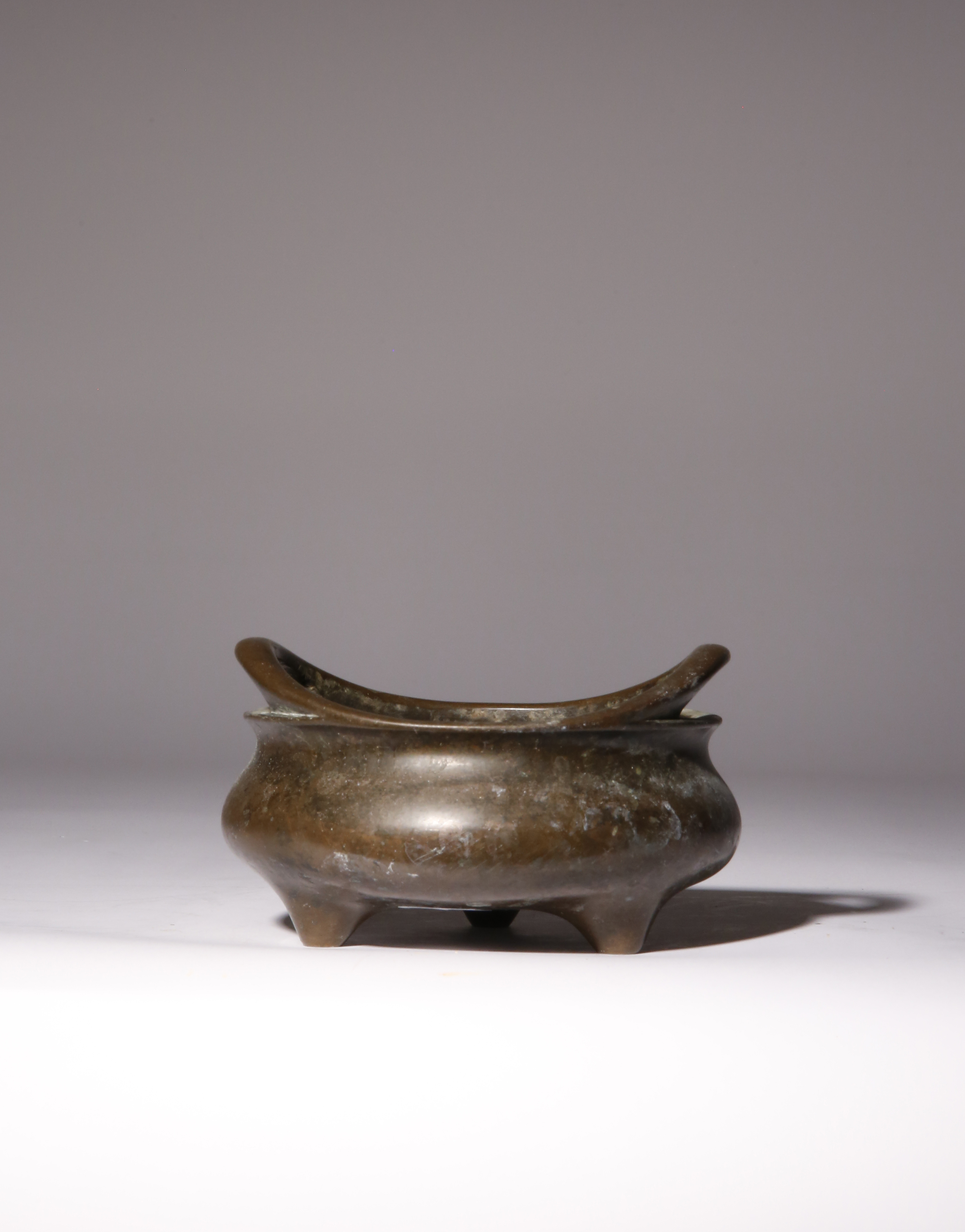The compressed circular body with two flaring loop handles above a short waisted neck, supported by three tapering feet, the base with a six character Xuande mark, 1.3kg, 14.5cm.