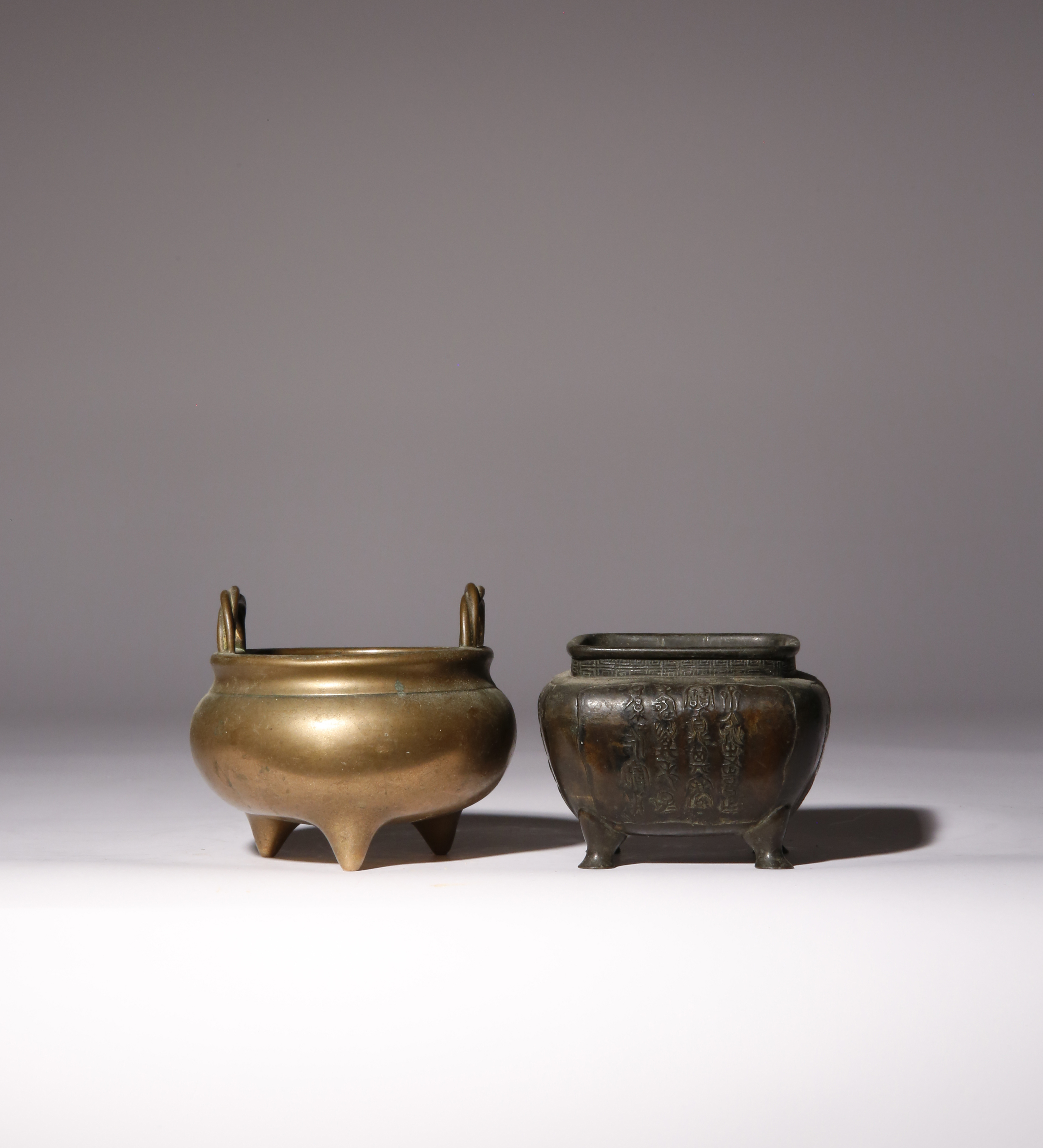 One raised on three tapering feet, set with two twisted rope handles, with a zhen wan mark, the other of square-section, decorated with four panels with archaistic inscriptions, 647g and 624g, 11cm and 9.5cm. (2)
