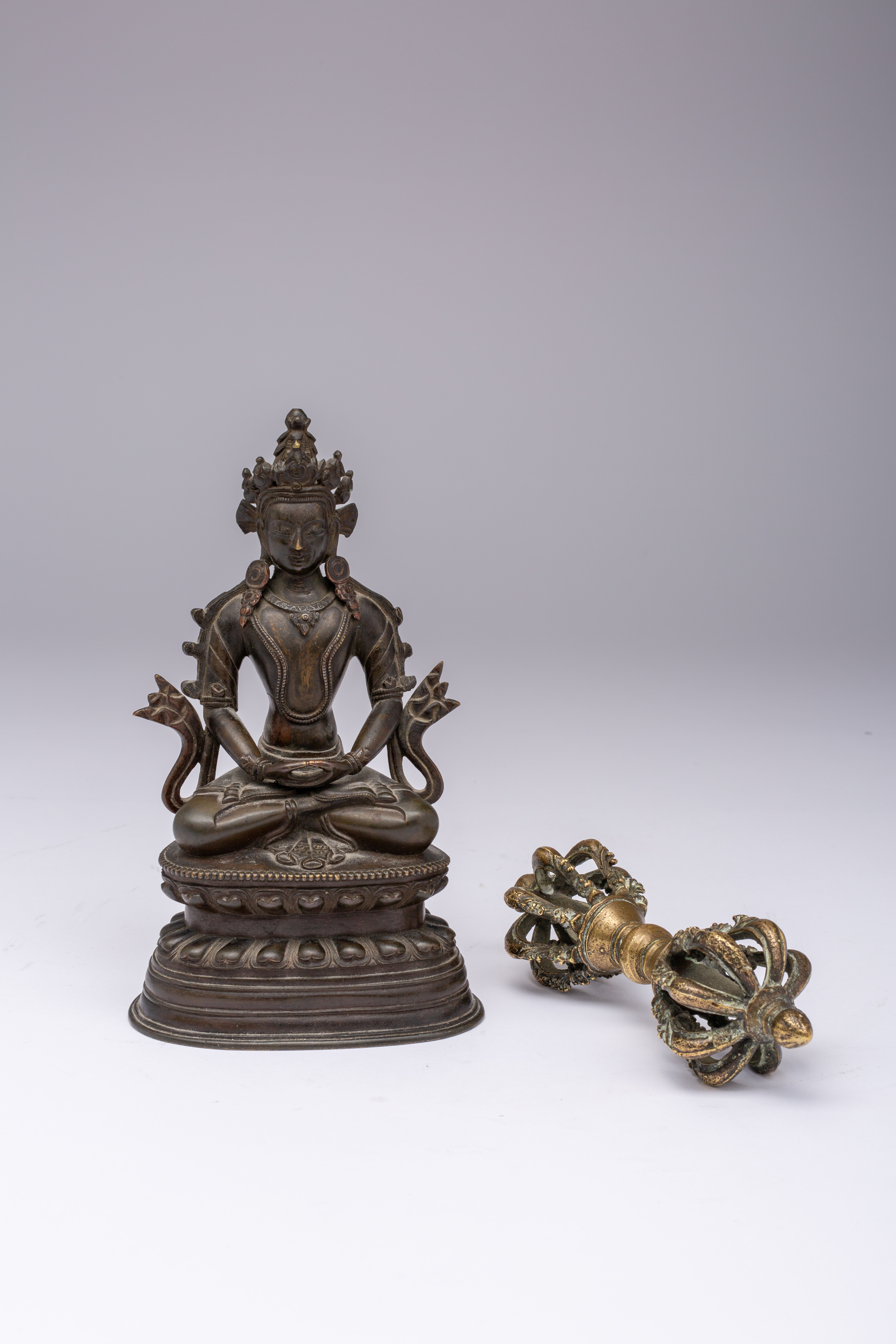 A CHINESE BRONZE FIGURE OF A BODHISATTVA AND A GILT-BRONZE VAJRA