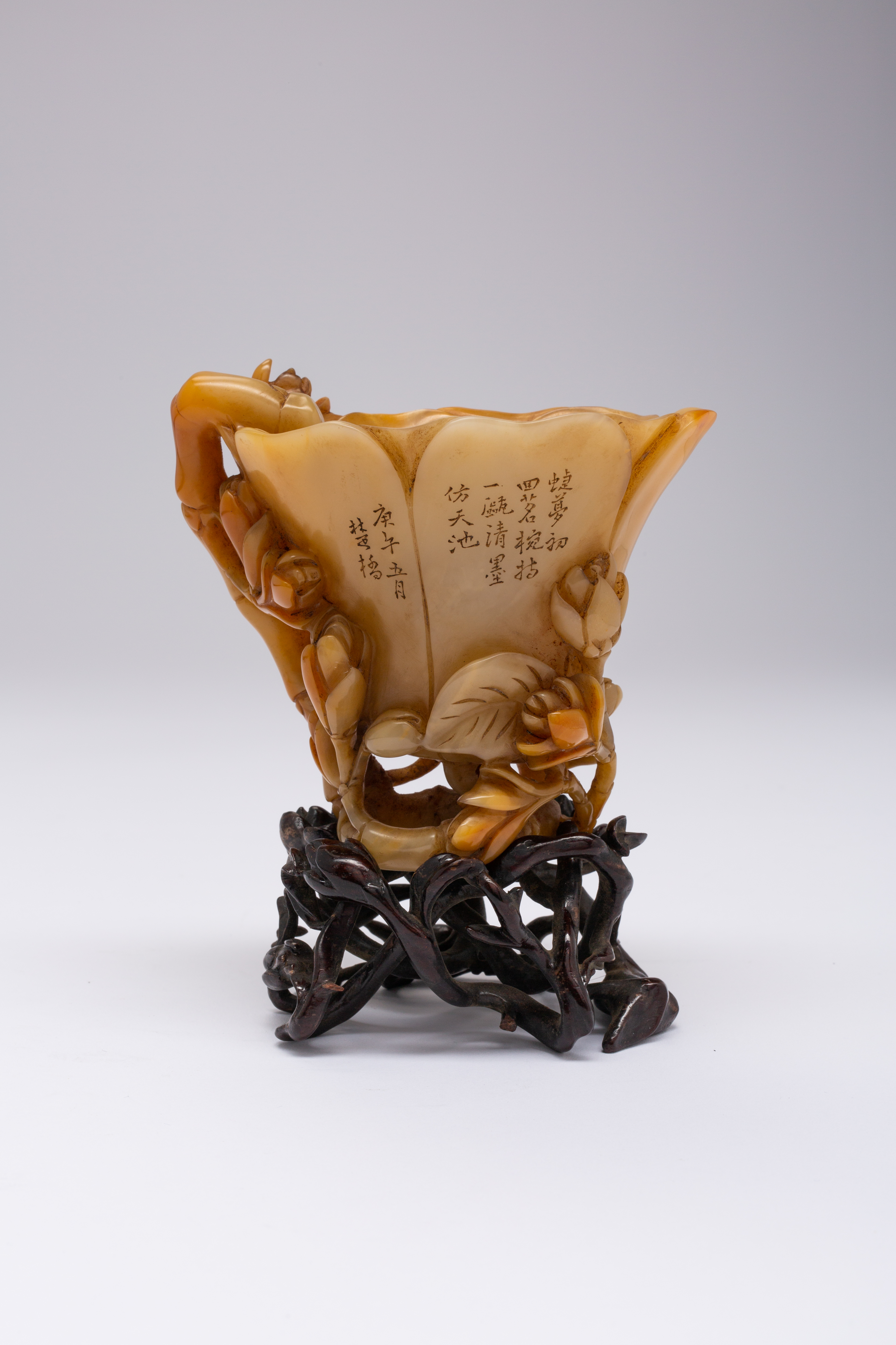 Imitating rhinoceros horn, the cup formed as a flowerhead, growing from a stalk handle issuing further flowers and leaves, one side inscribed with calligraphy, raised on high reticulated lacquered wood stand, 9cm. (2)