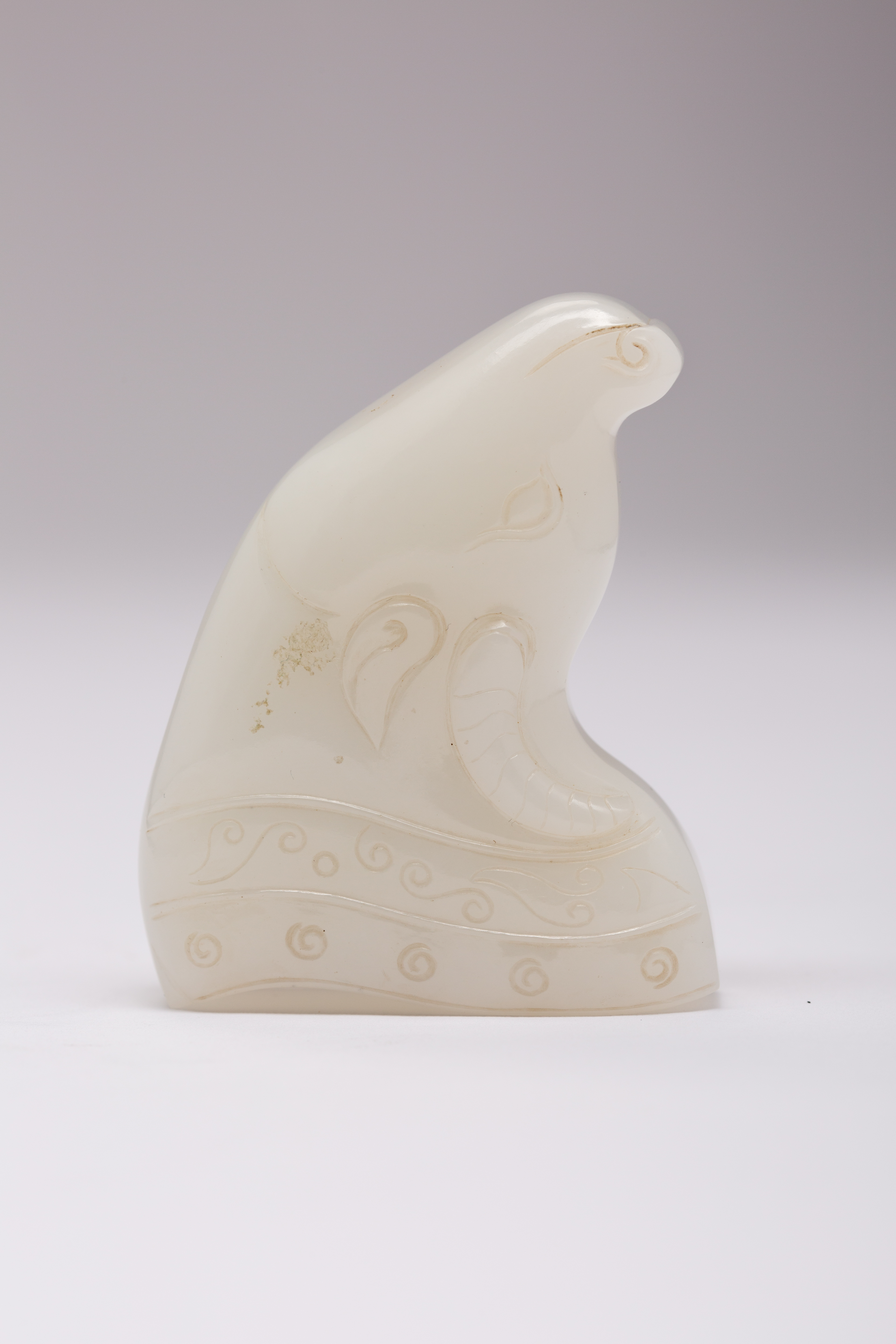 The flattened body carved in relief with the head of an ox, the rim with two bands of scrolls, 7cm.