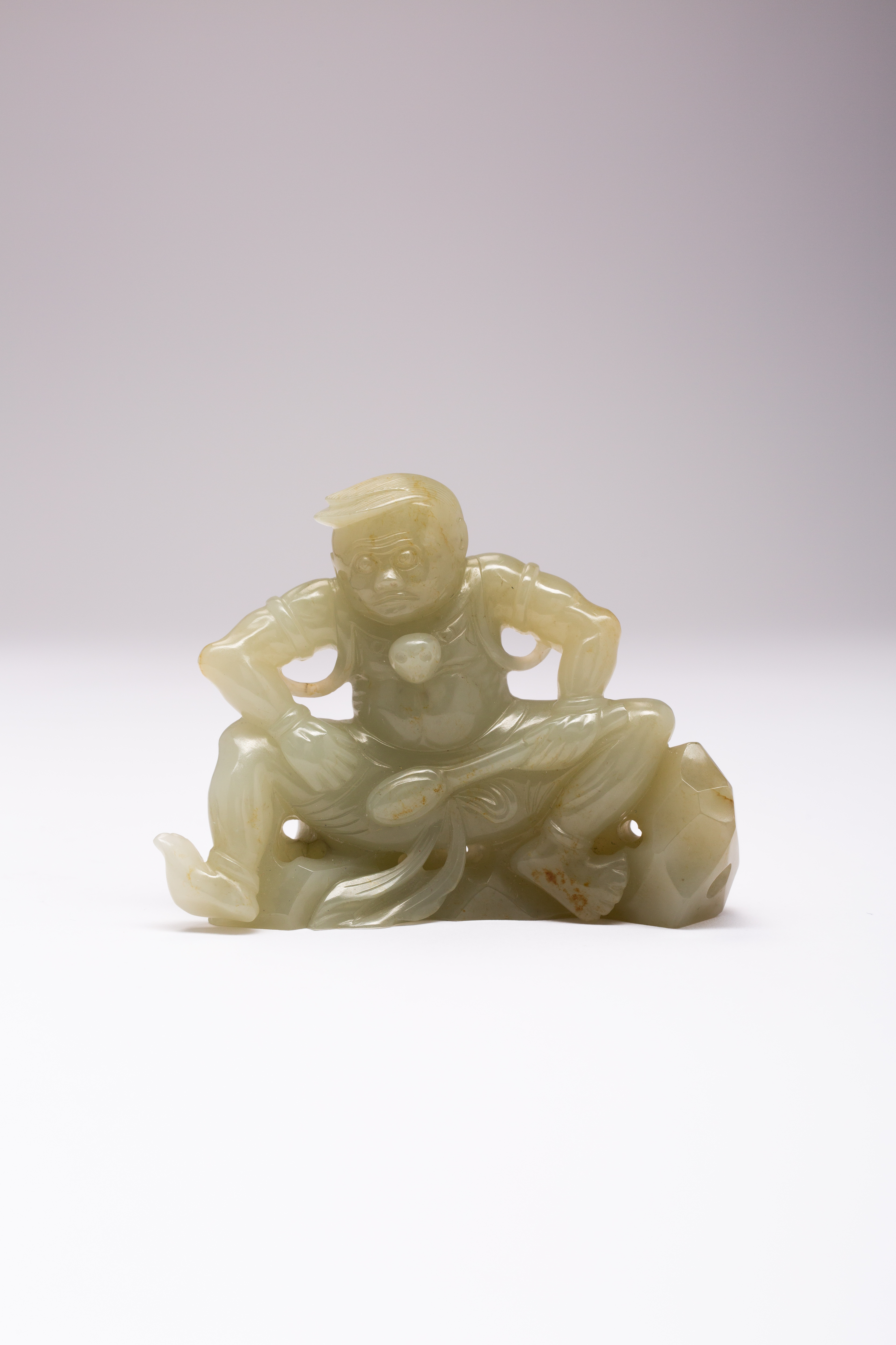 A CHINESE CELADON JADE CARVING OF A DEMON