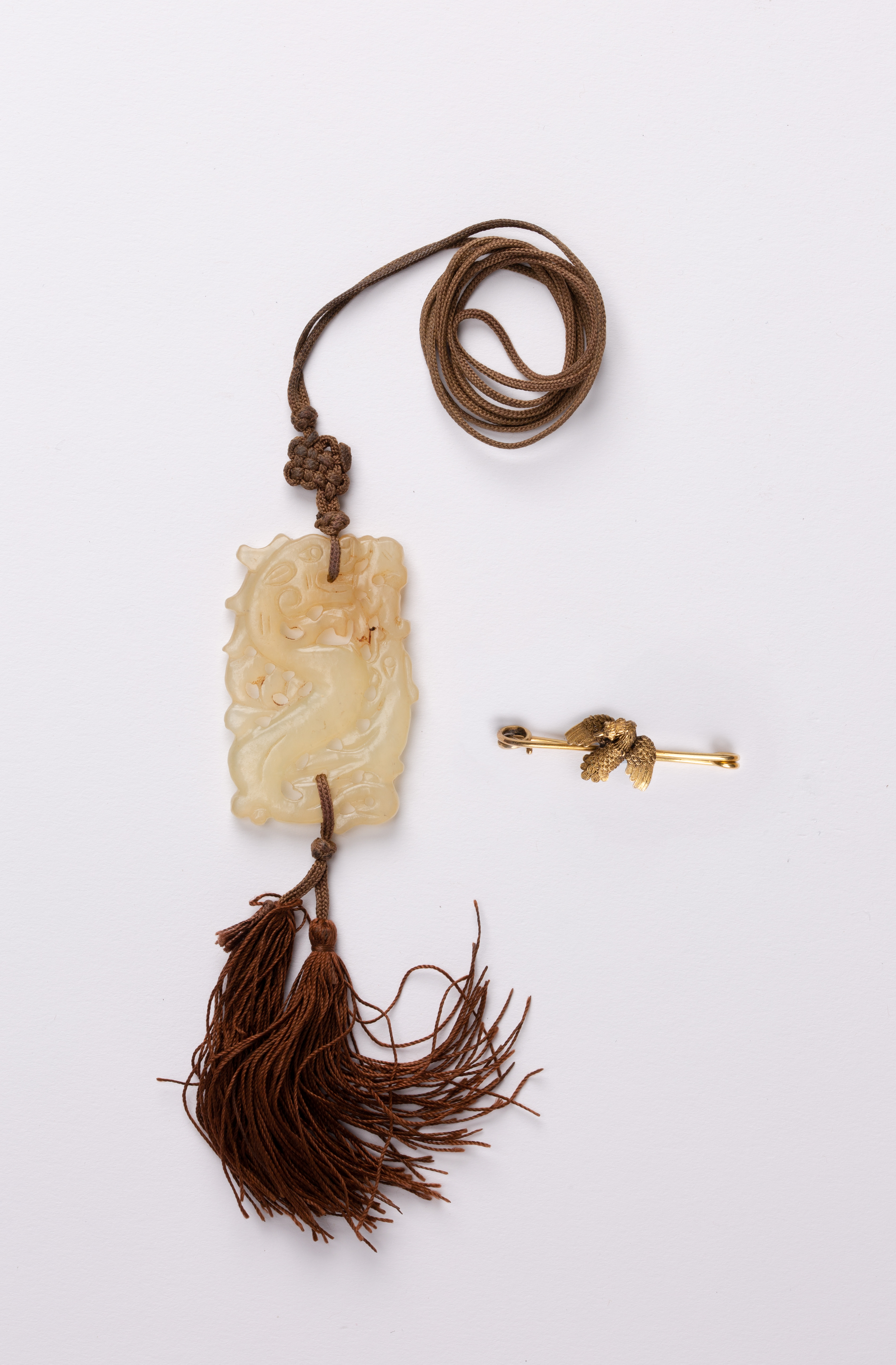 The pendant carved with a sinuous dragon and a fish, the brooch as a small bird, with marks which read 20 and WH, probably referring to Wang Hing, 3g and 3.8cm the brooch, 4.5cm the pendant. (2)