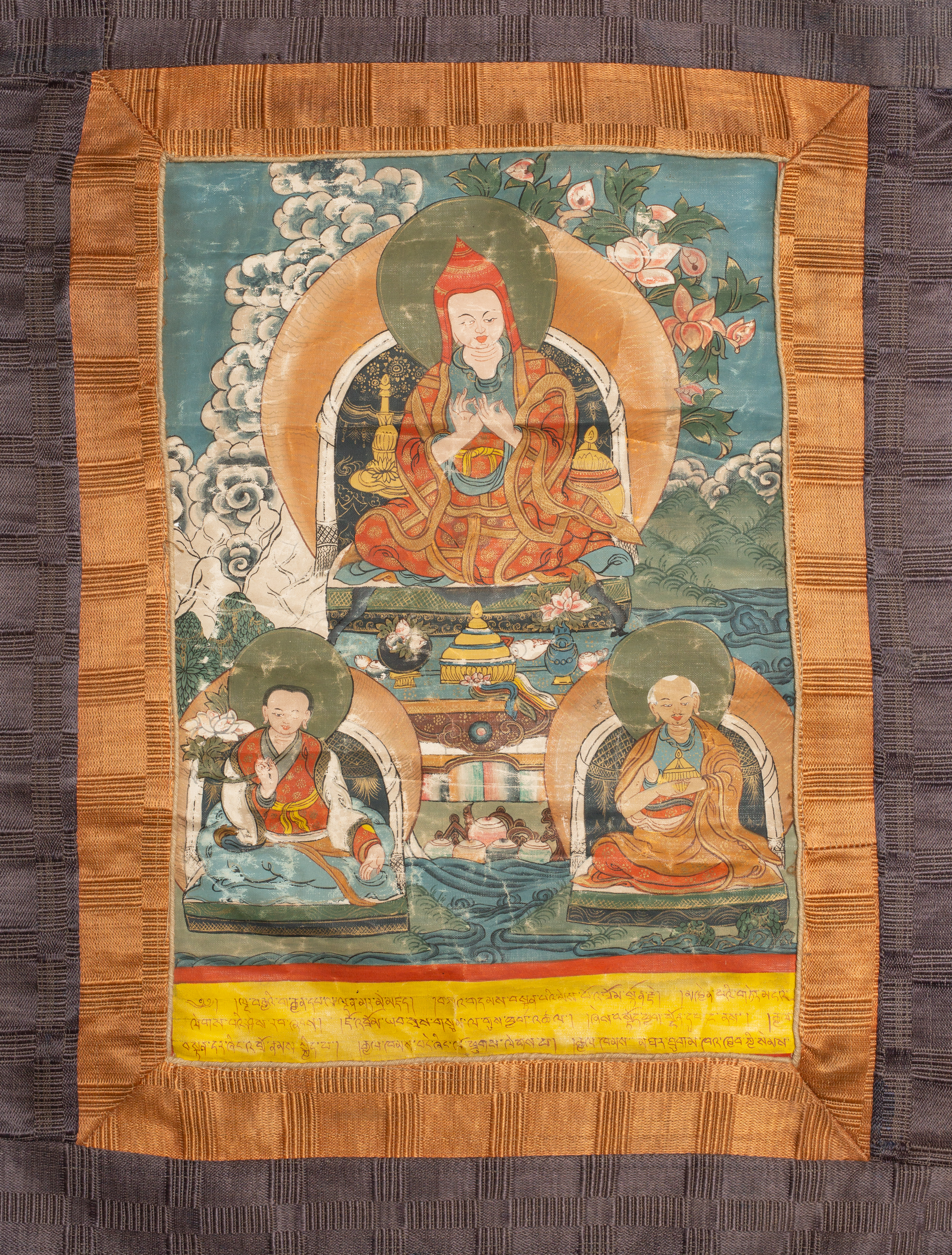 The Lama depicted wearing long flowing robes with his hands held in dharmachakra, the lower register with two Buddhist figures, above calligraphic inscriptions, mounted in silk, 33cm x 23cm.