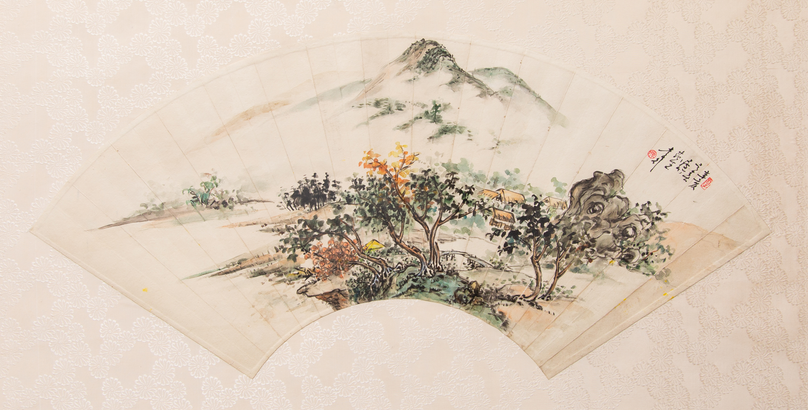 Two Chinese fan paintings, ink and colour on paper, both inscribed and signed Li Yin with two artist's seals which read Linzi, framed and glazed, 53cm wide. (2)