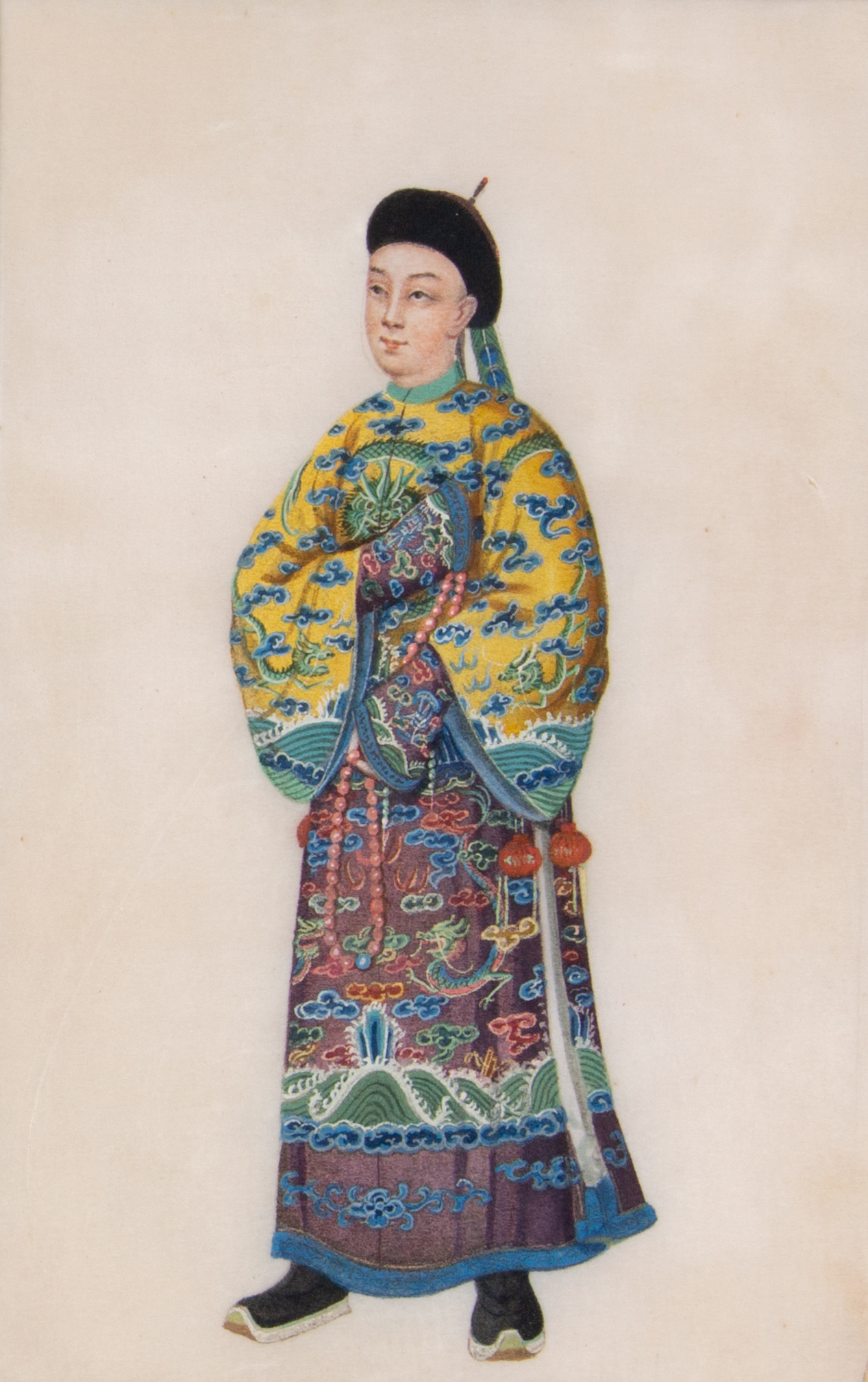 The card-bound album leaves contain eight pictures of Chinese officials and ladies, ink and colour on rice paper, each carefully decorated and wearing appropriate dress, 23cm x 16cm.