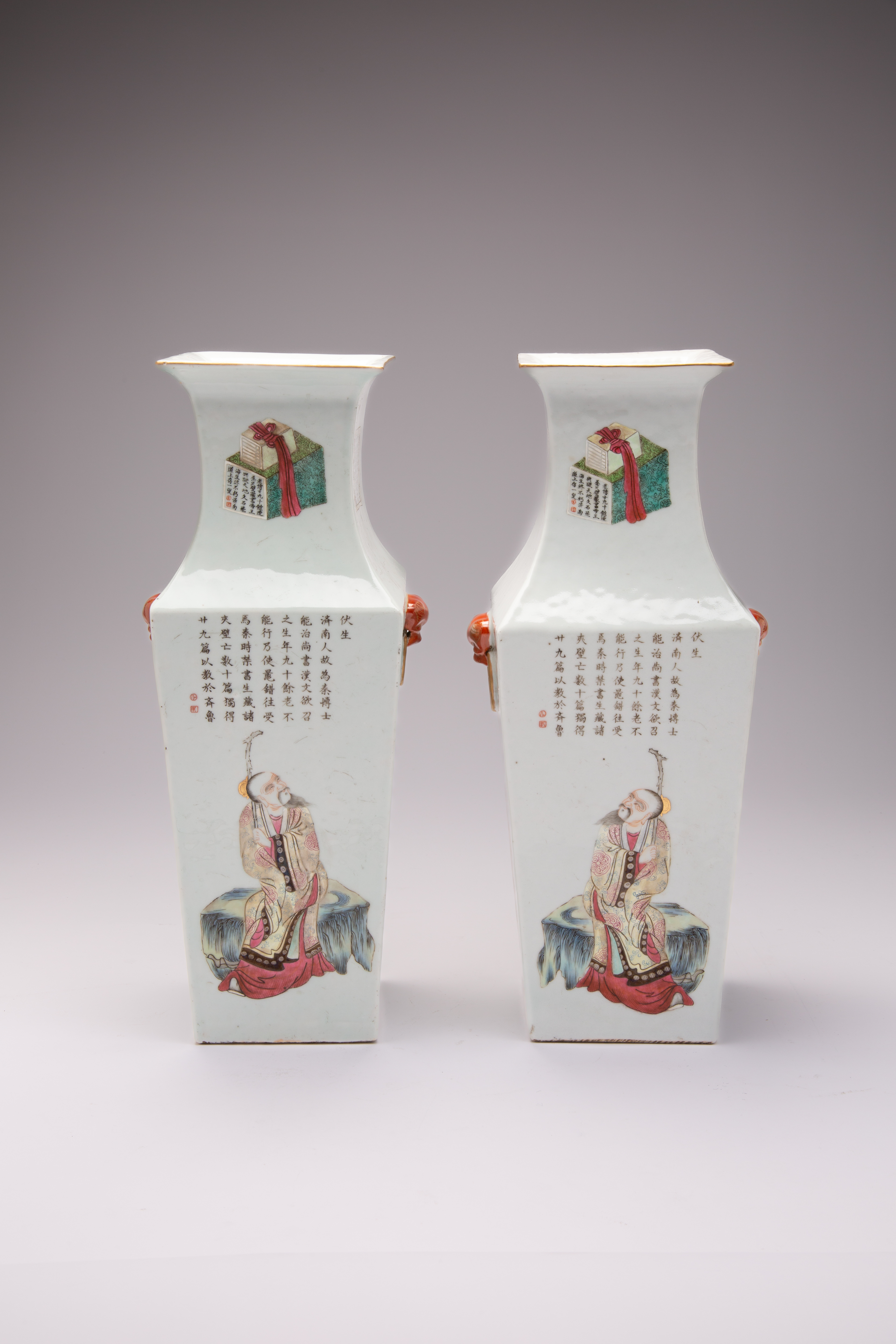 Each decorated with solitary figures beneath their titles, the waisted necks with precious objects and further calligraphic inscriptions, each set with a pair of animal mask ring handles, 40.7cm. (2)