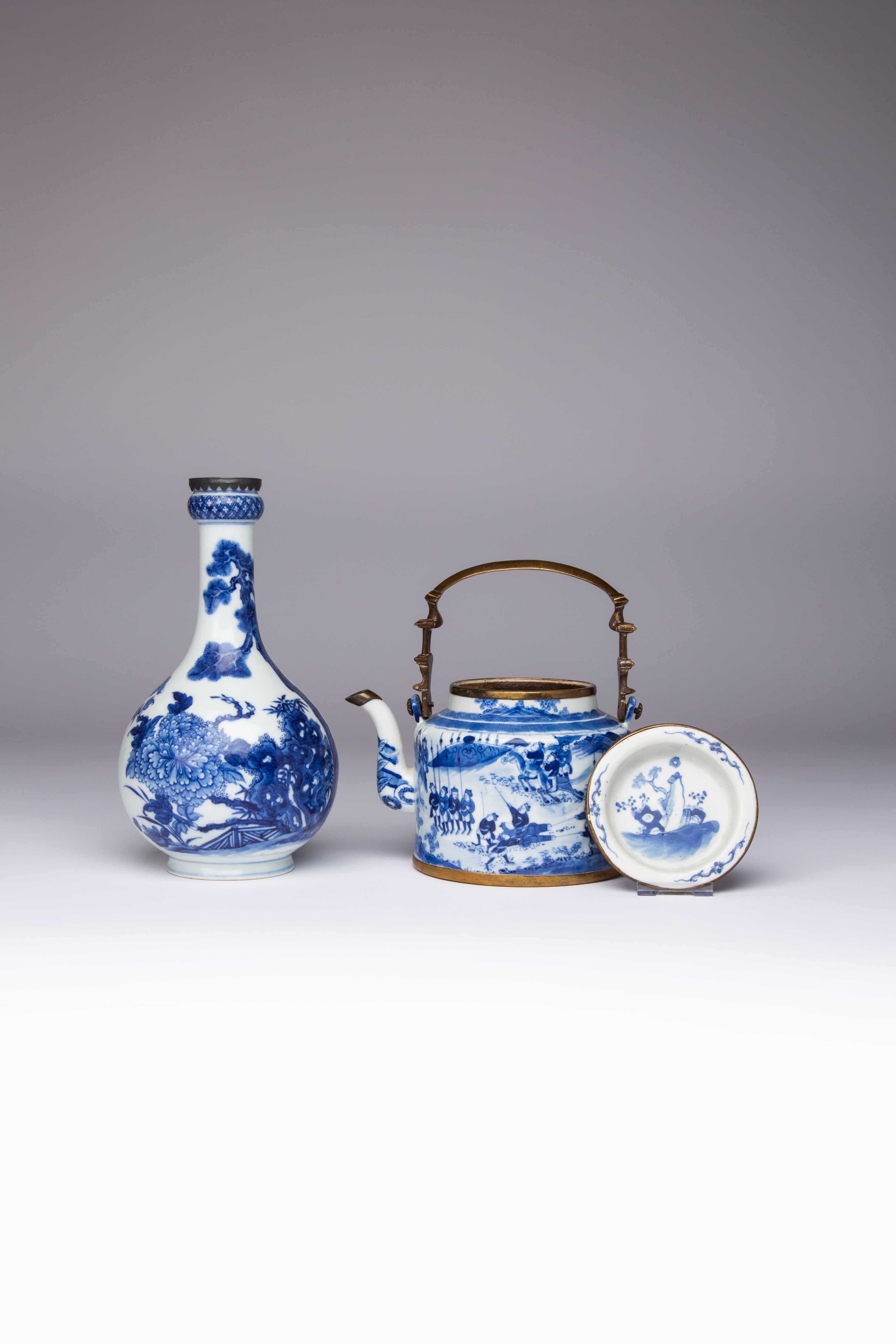 Each mounted with metal, the bottle vase painted with peonies growing from leafy branches below a pine tree, with a paper label for Christie's to the base, the teapot decorated with a hunting scene, the base with a Kangxi mark, 23.5cm and 18cm. (3)