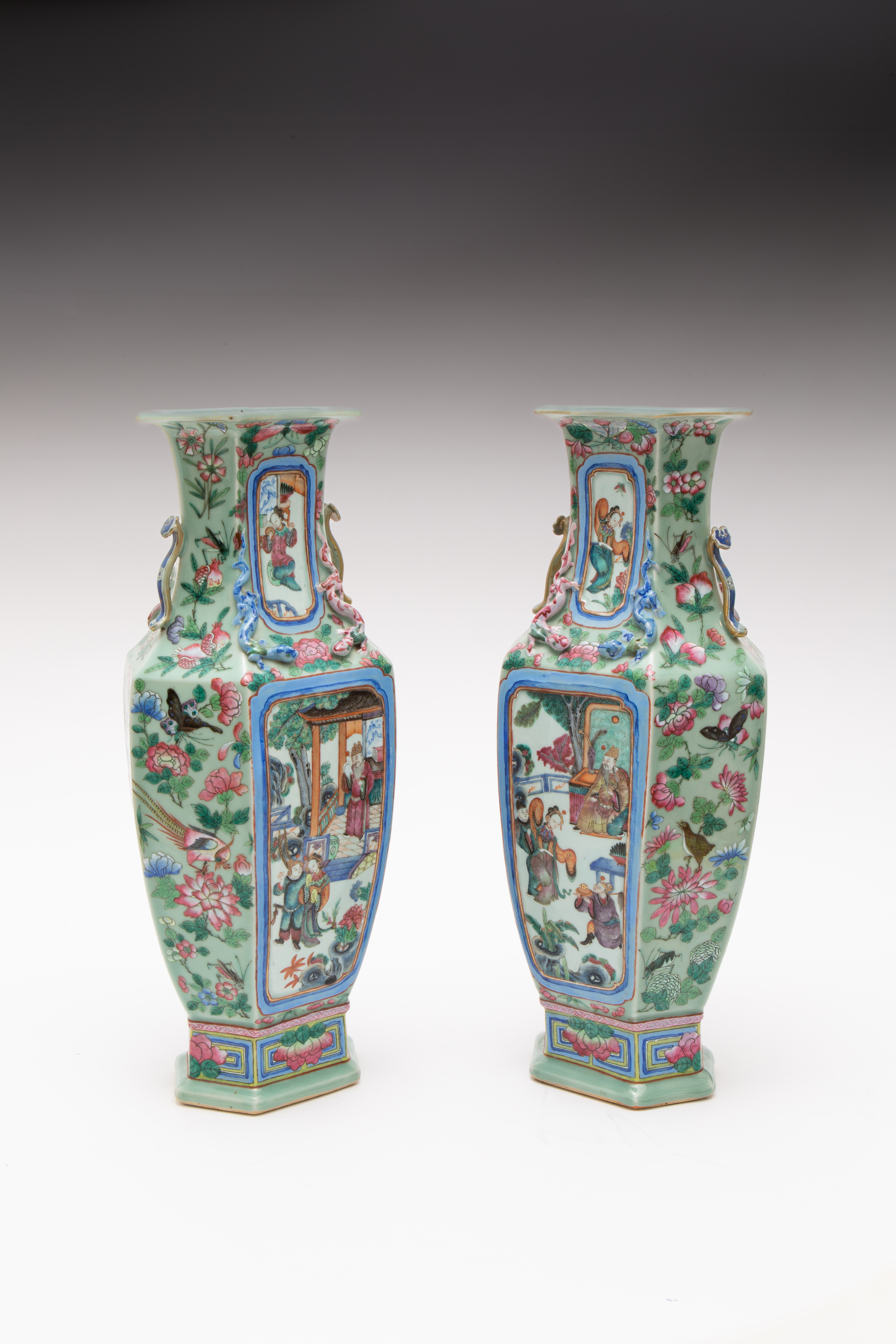 Each of hexagonal-section, painted with panels enclosing dignitaries, ladies and actors, surrounded by birds and insects perched amidst blossoming flowers, each waisted neck with moulded chilong and a pair of ruyi-sceptre handles, all reserved on a celadon-ground, 59.8cm. (2)