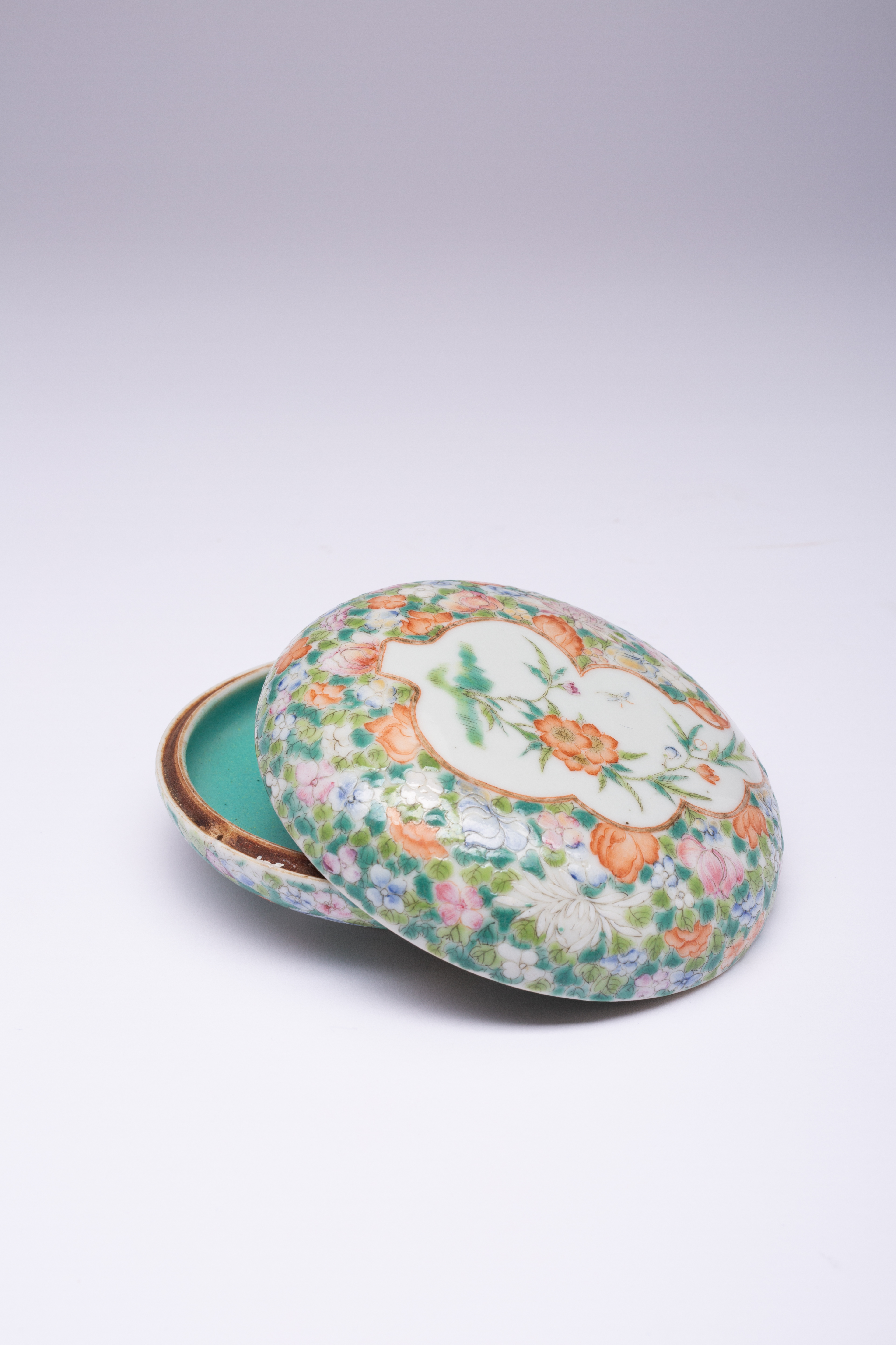 Painted with a leaf-shaped panel of flowers on a millefleurs ground, the interior and base turquoise, with a Ju Ren Tang zhi mark, 11cm. (2)