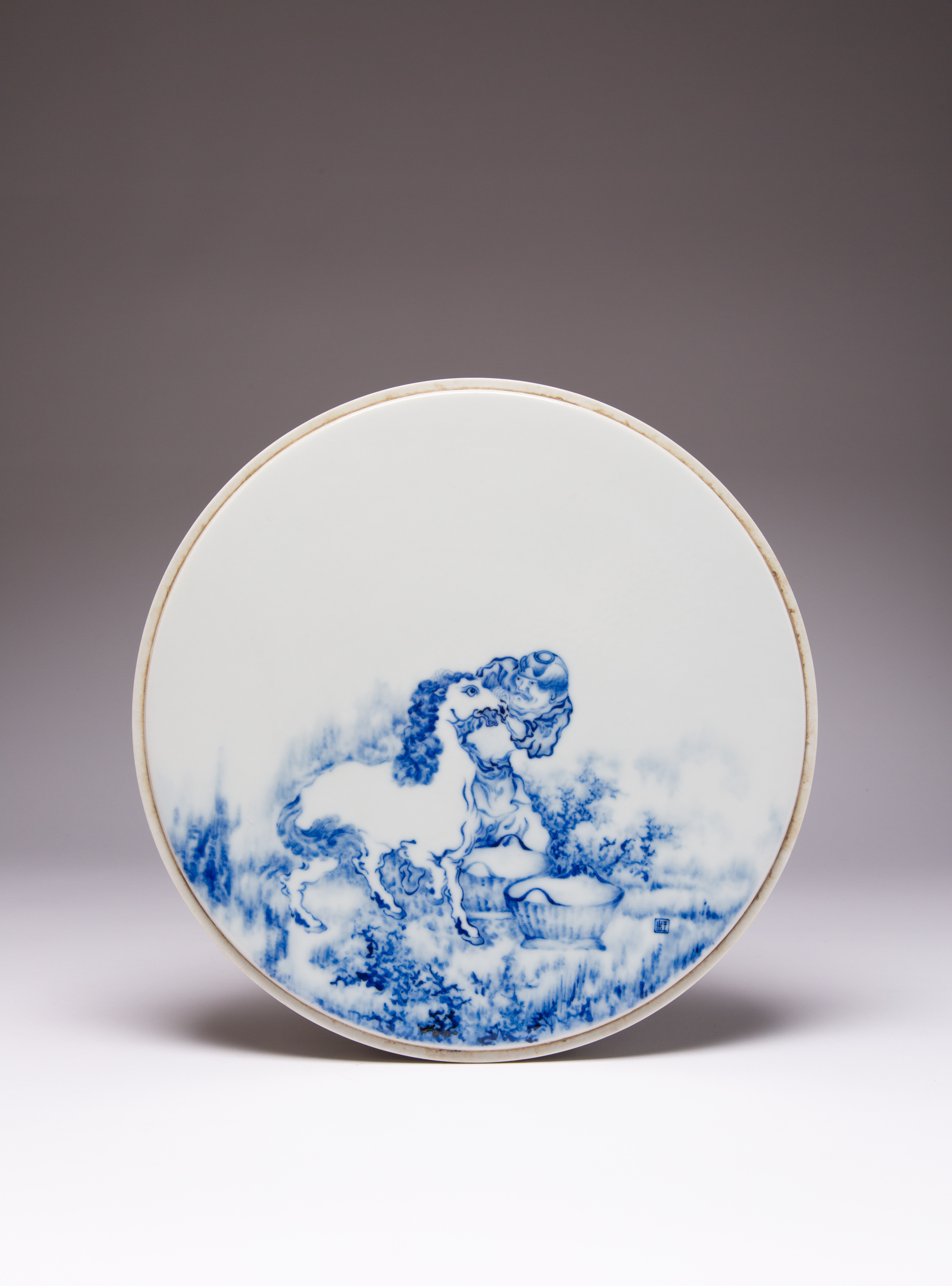 A CHINESE BLUE AND WHITE CIRCULAR PLAQUE AFTER WANG BU