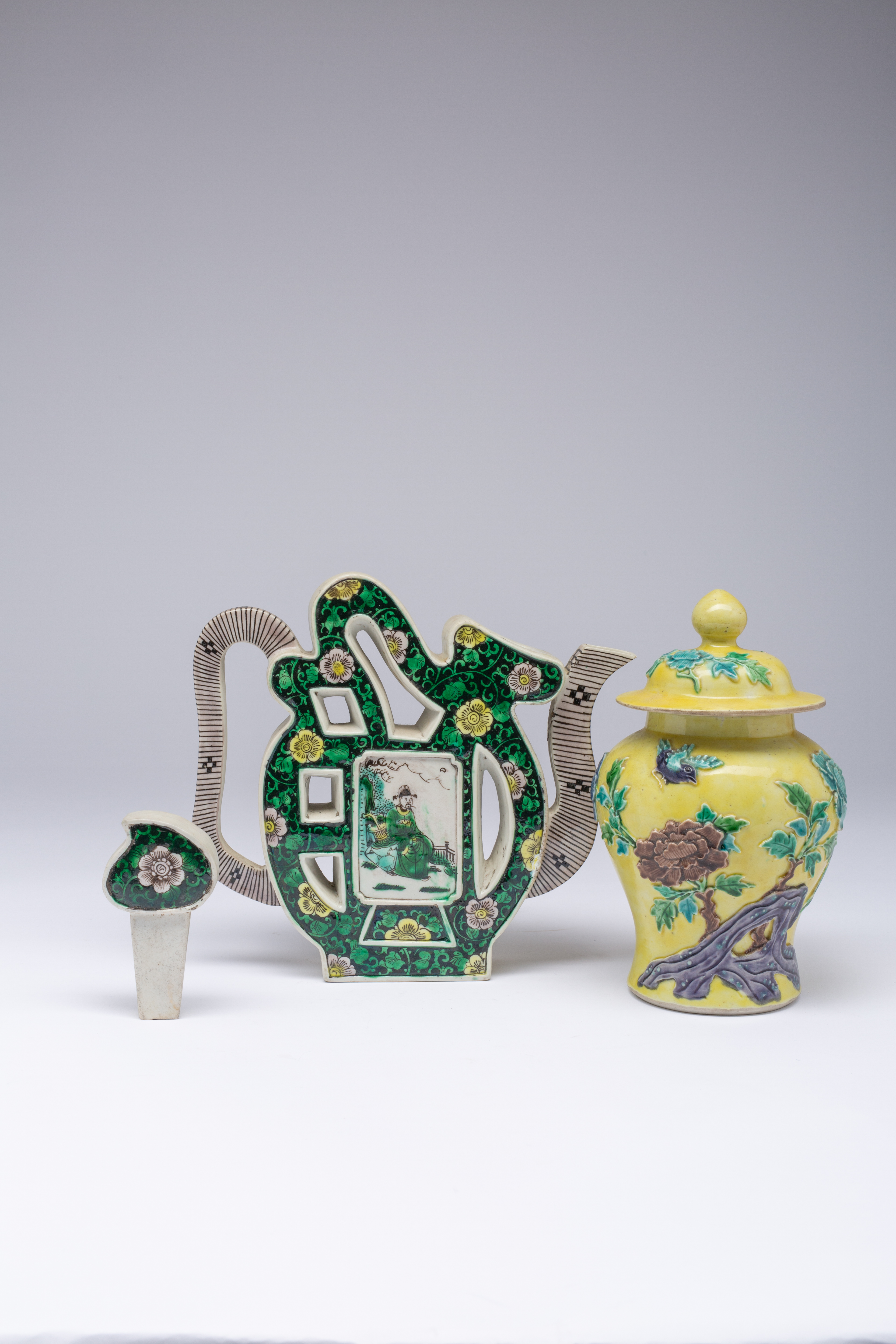 The body painted with two panels of figures, the base with a Kangxi mark, together with a yellow-ground baluster vase and cover, moulded with chrysanthemum, with a moulded Wang Bingrong mark, 19.5cm. (4)