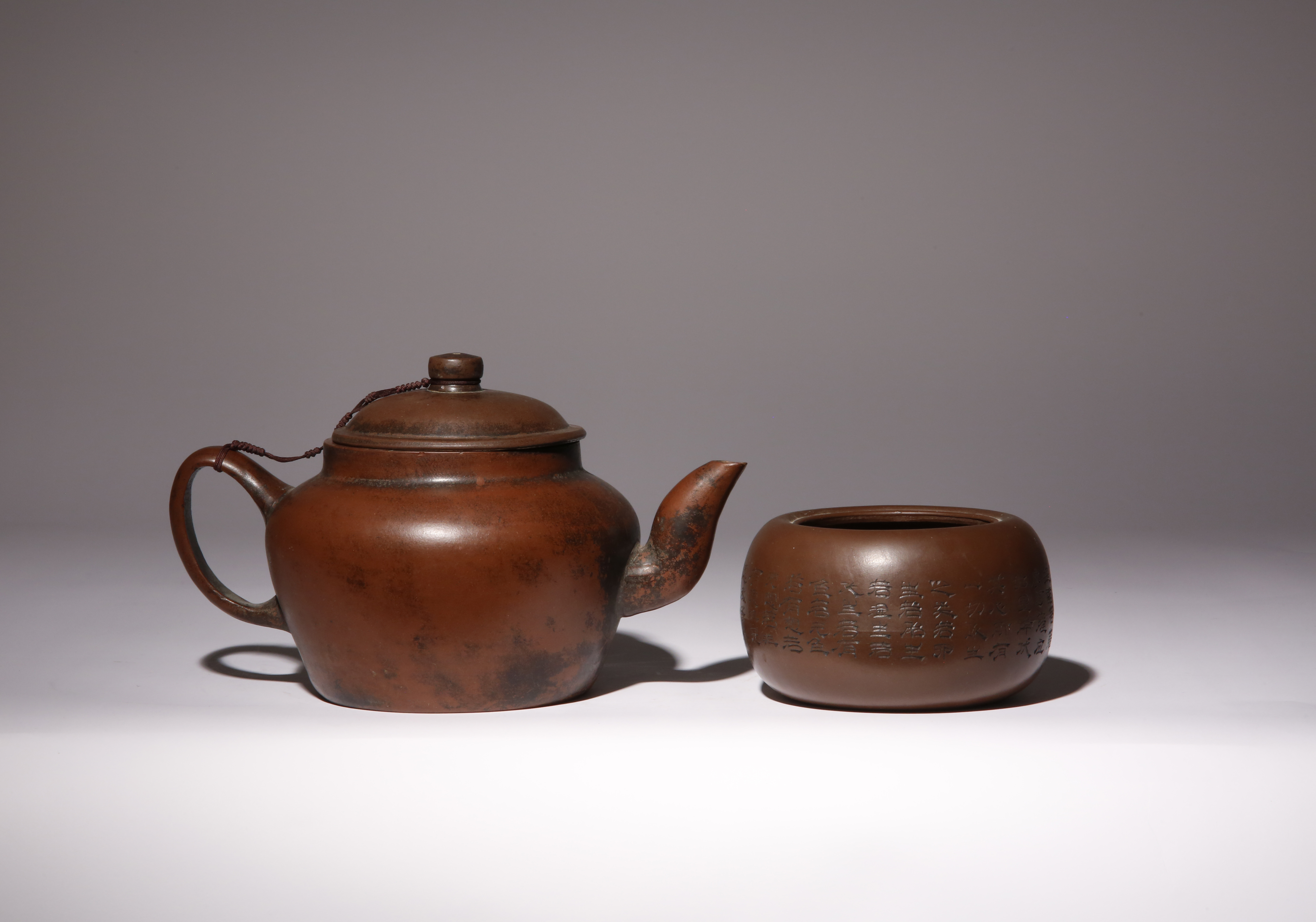 The plain teapot with a paper label for C Y Tse Antiques & Collectibles and two seal marks reading Jingxi and Shao Yuanxiang zhi to the base, the alms bowl incised with a text from the Diamond Sutra and a signature reading Zhenliang, the base with a four character mark, 31cm and 16.5cm. (3)