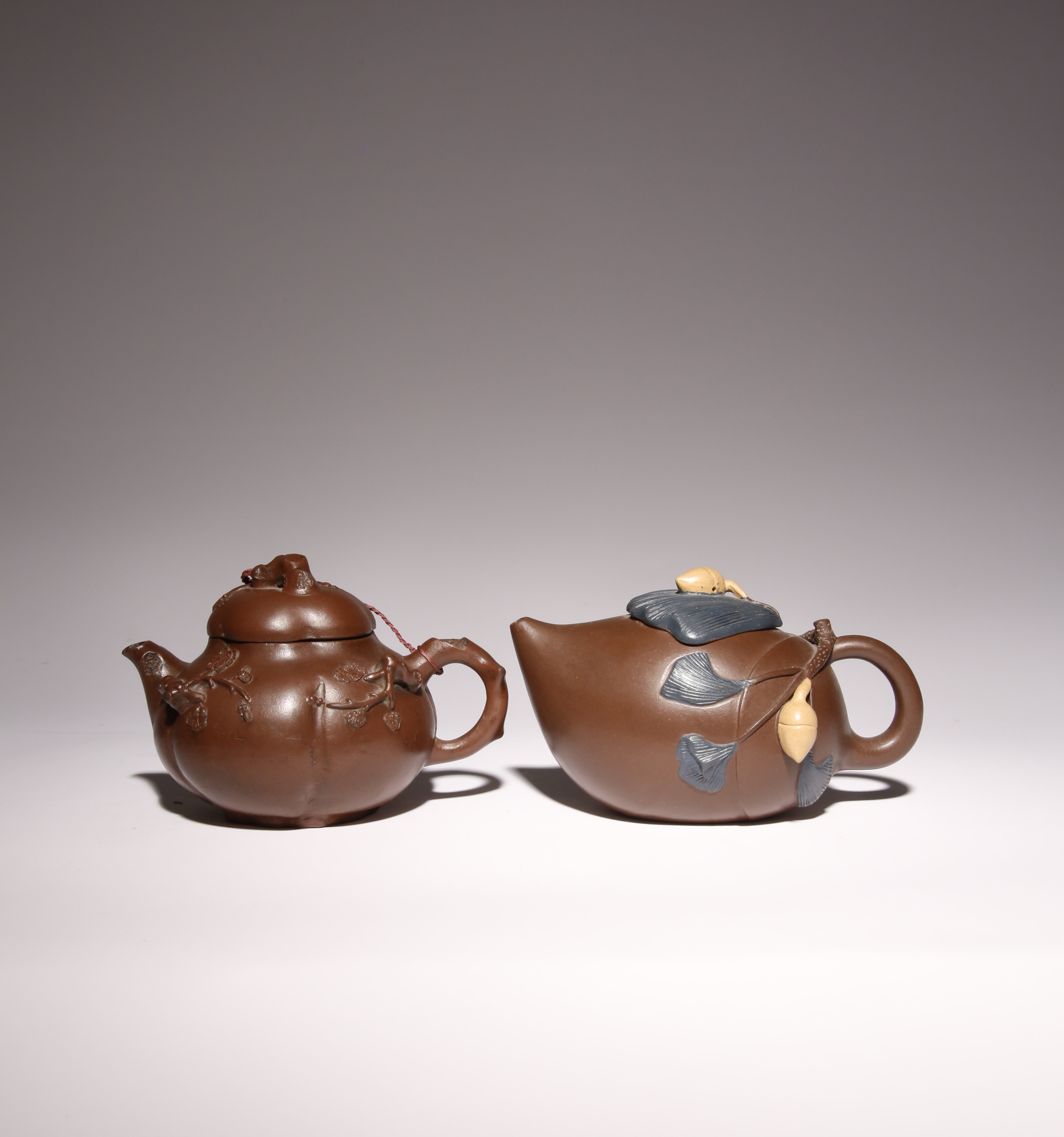 One decorated with ginkgo nuts and branches to the ovoid body, the base with an artist's seal reading Wu Yayi Zhi, the leaf-shaped cover with two seals reading Wu and Yayi, the other lobed teapot with sprays of blossoming prunus to the sides, the spout, handle and knop formed as the branches, the cover with two seal marks, 17.5cm and 14.7cm. (4)