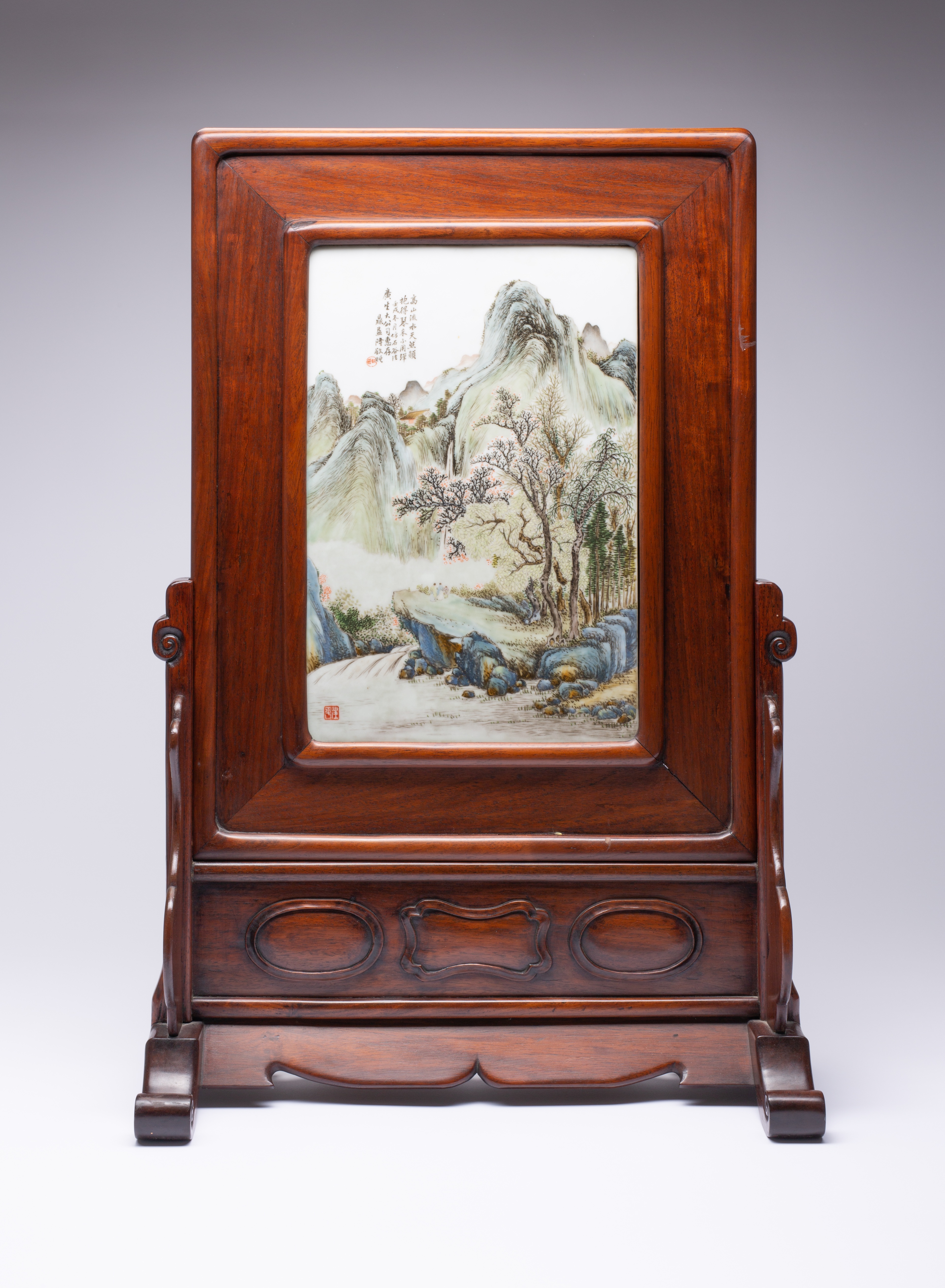 Set with a rectangular panel painted with a mountainous landscape with figures before a waterfall beneath an inscription, with a red seal mark, which reads Wang Ping, the back with a signature of Wang Yeting, the hardwood stand with scroll feet and shaped panels, 75cm x 50cm x 23cm. (2)