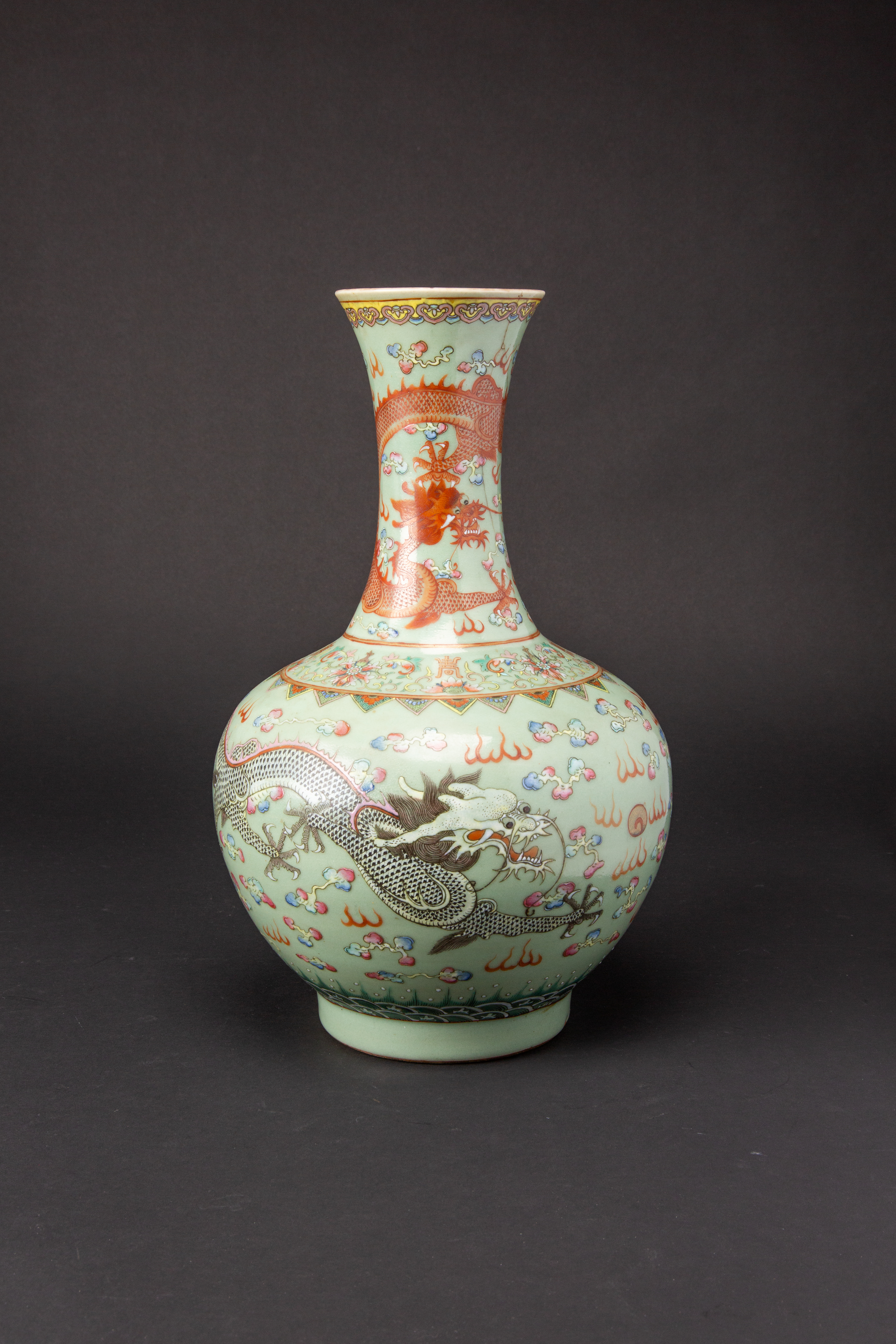 A CHINESE CELADON FAMILLE ROSE 'DRAGON AND PHOENIX' BOTTLE VASE