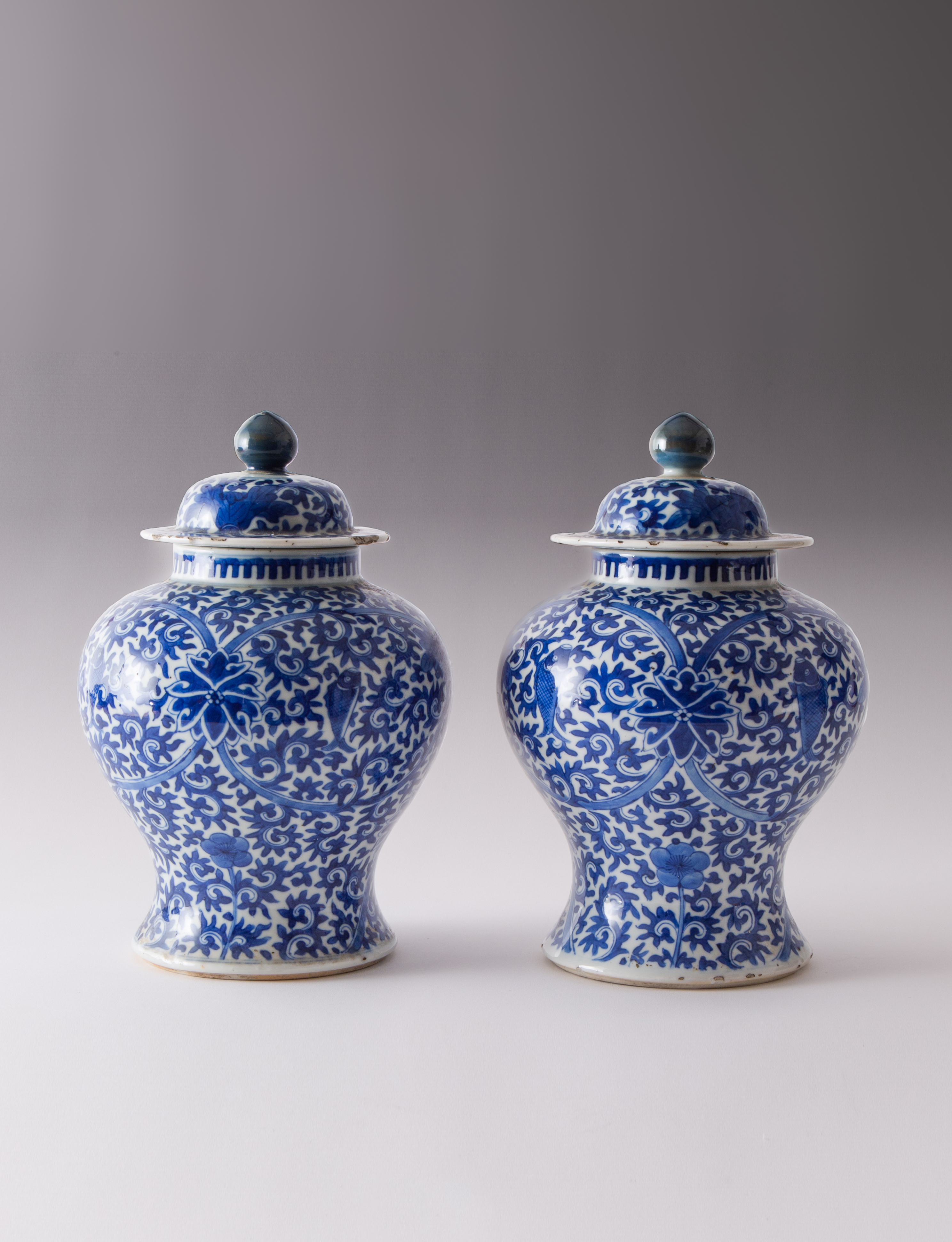 A PAIR OF CHINESE BLUE AND WHITE BALUSTER VASES AND COVERS