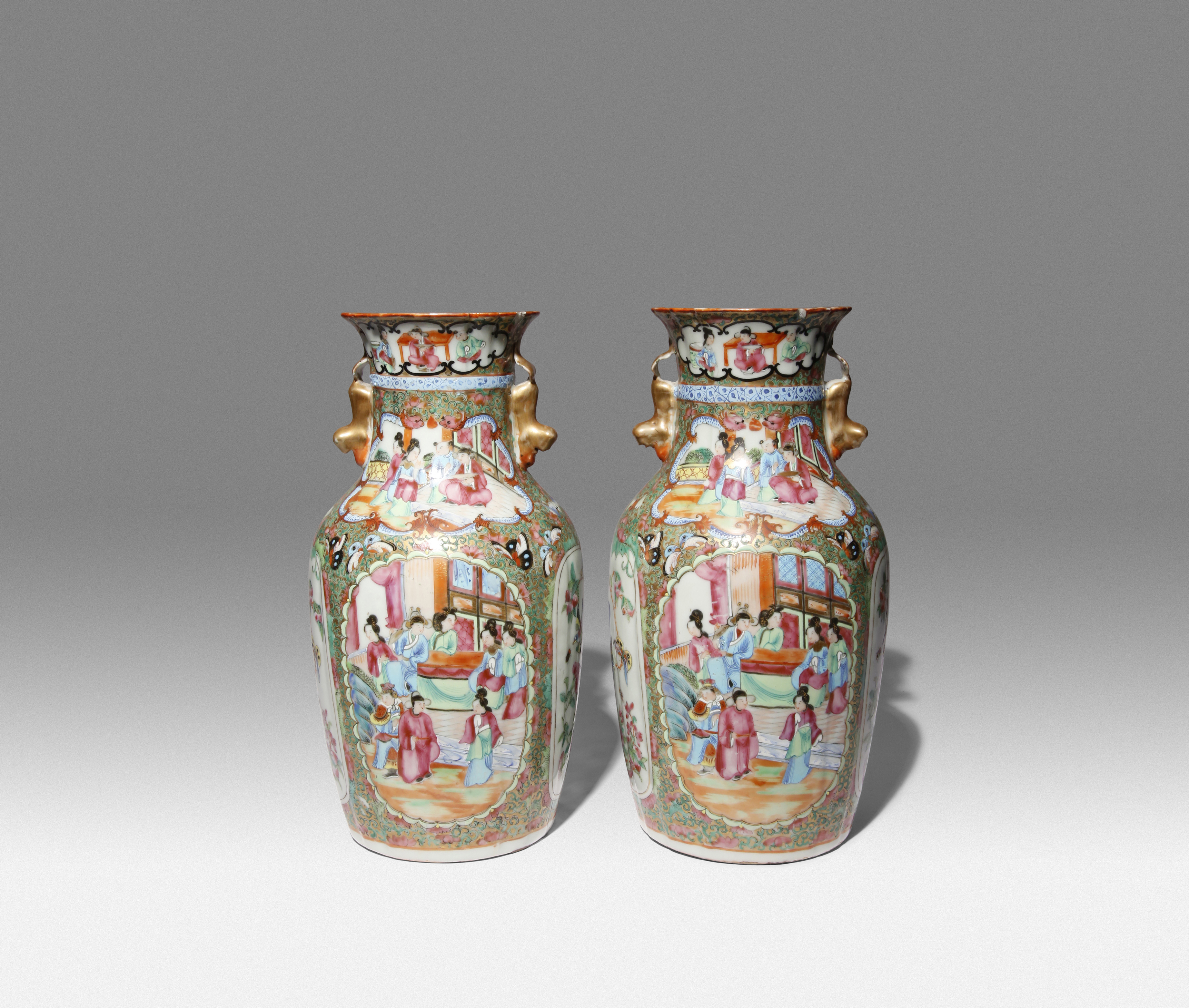 Each painted with large panels containing courtly figures with attendants, fruiting floral branches with birds and insects, all reserved on a gilt-ground of dense lotus scrolls interspersed with precious objects, bats and butterflies, the waisted necks with simulated brocade sashes, flanked by mythical beast handles, 34.5cm. (2)