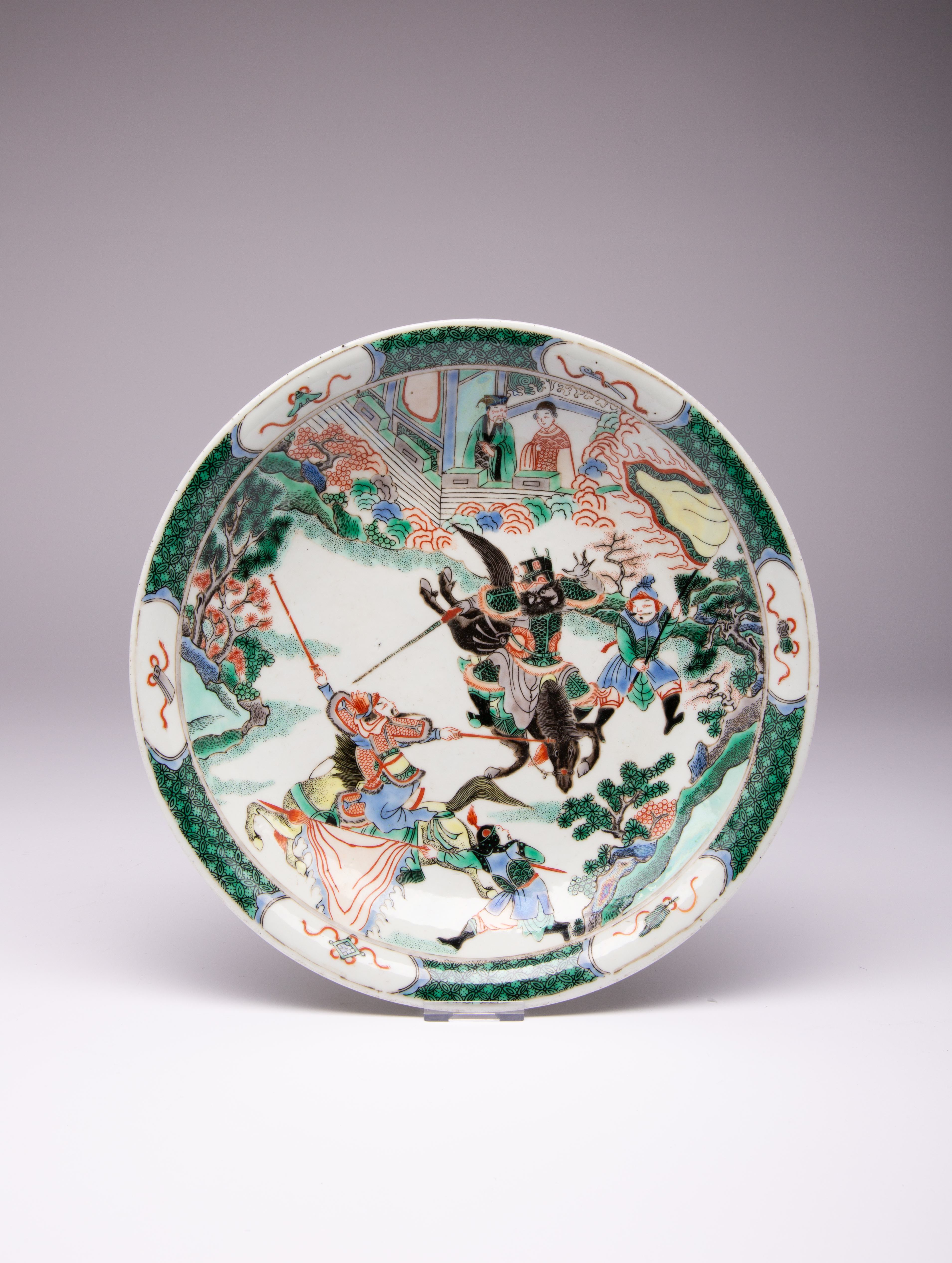 Painted with equestrian warriors and two bannermen before spectators, the reverse with a channelled foot rim and a Kangxi mark, 28.5cm.