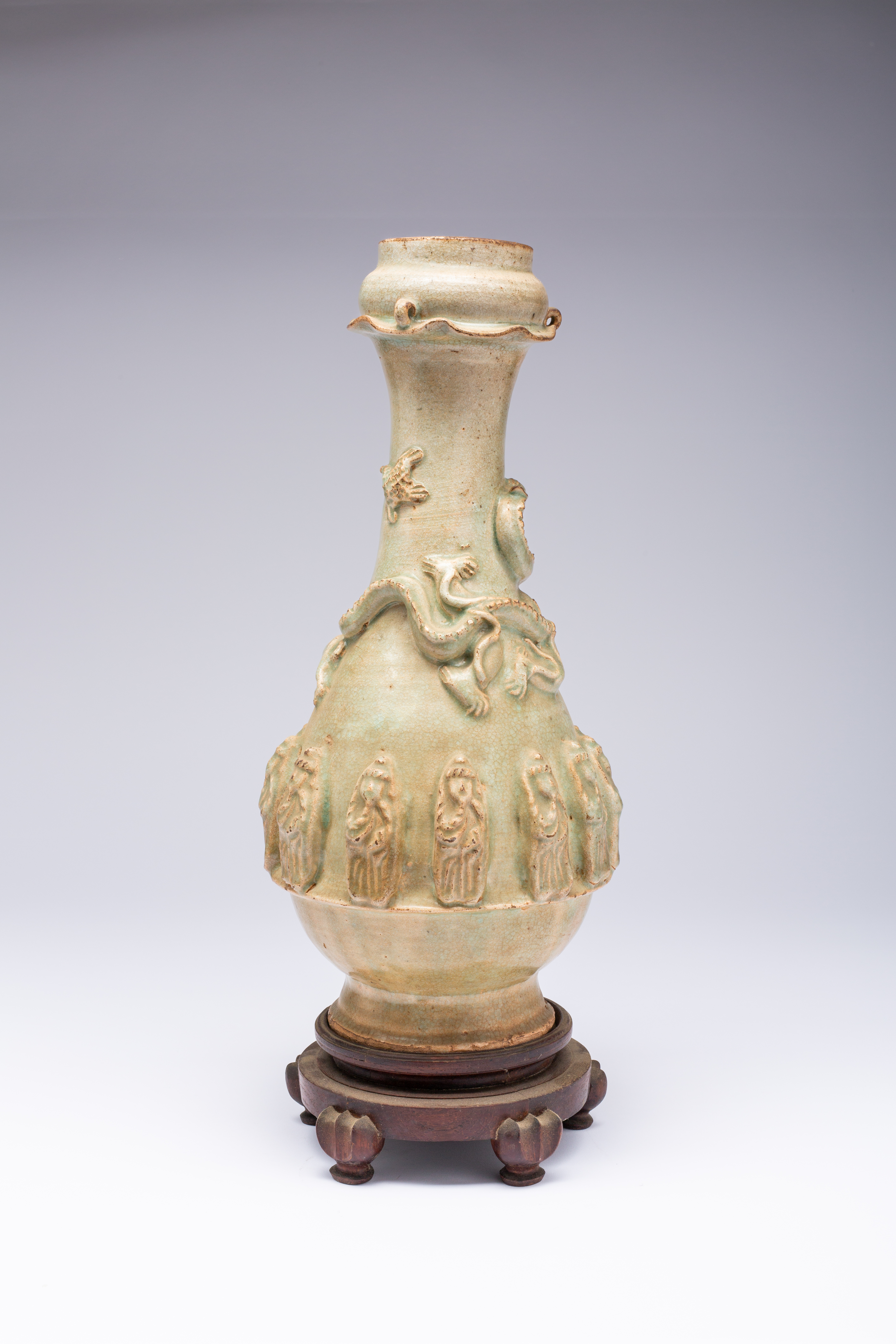 The pear-shaped body decorated with applied figures, a striding dragon, a dog and a bird in flight, the bulbous upper-section set with three loop handles, covered with a translucent greyish-green glaze, a wood stand, 42cm. (2)