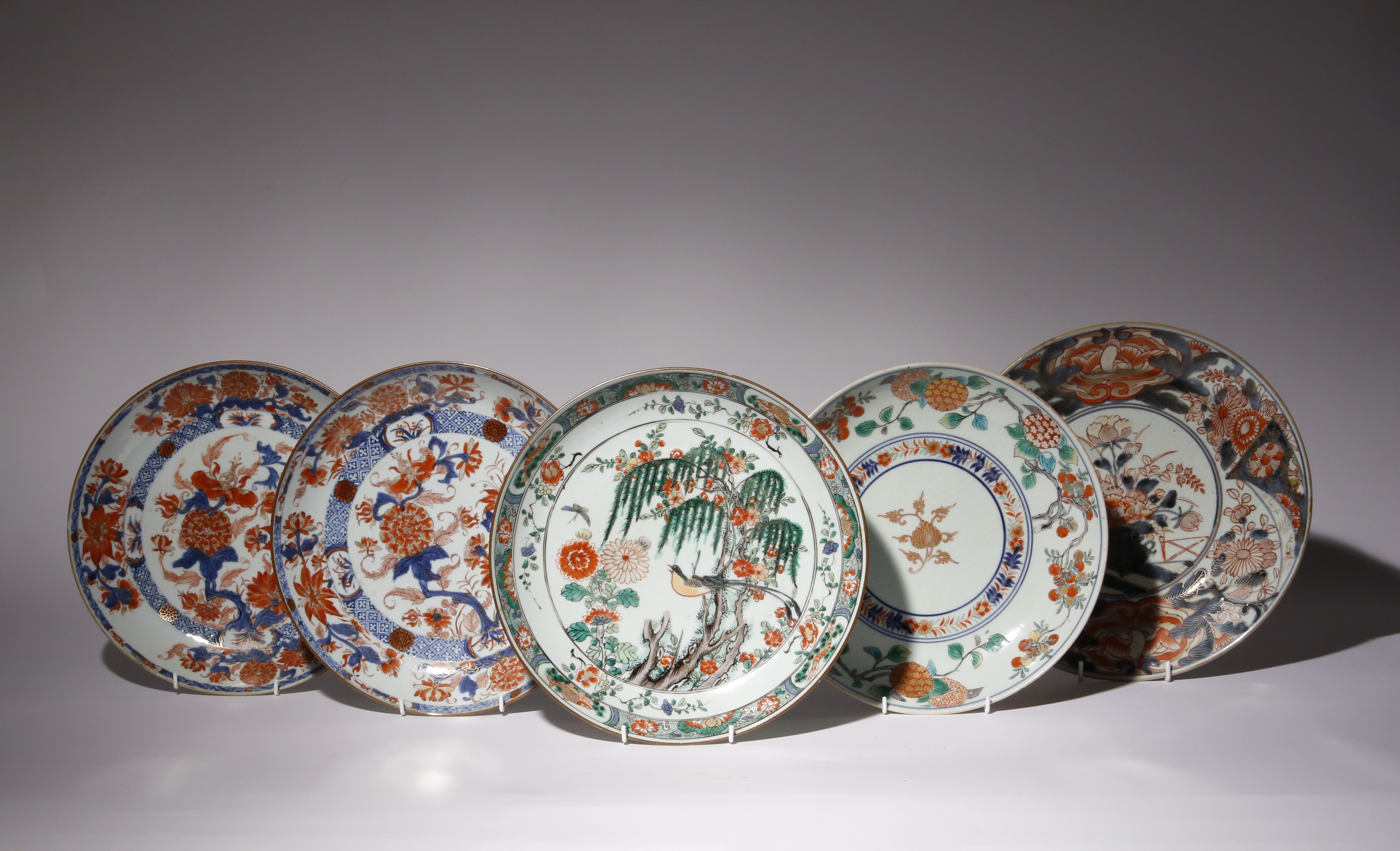 Comprising: a Chinese famille verte dish painted with a bird in a tree, a pair of Chinese Imari dishes, a Japanese Imari dish, and a Japanese verte Imari dish, 28.5cm max. (5)