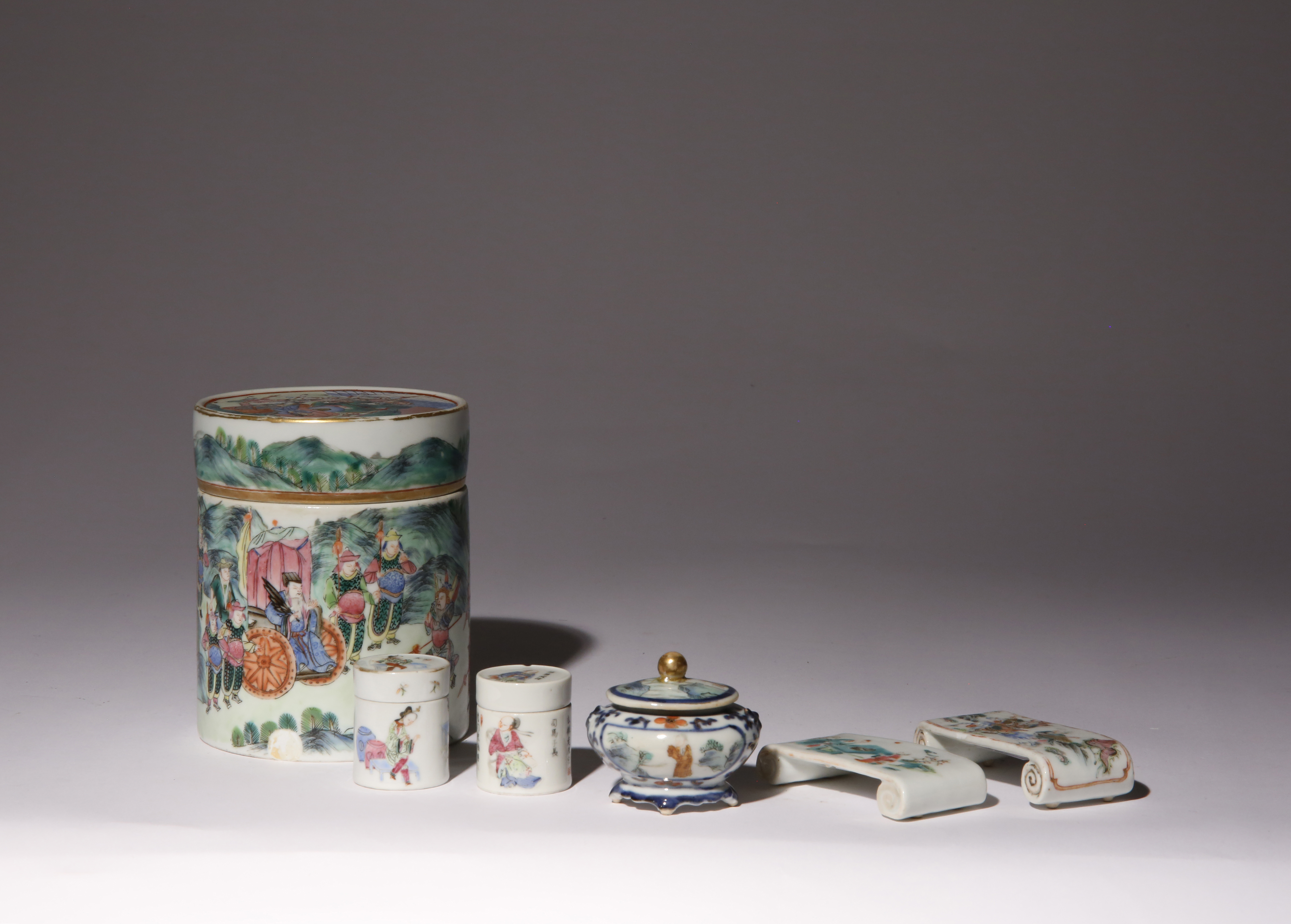 Comprising: a jar and cover painted with Zhuge Liang and warriors, three smaller jars and covers, two miniature scroll-end brush rests, variously decorated with figural scenes, 12cm max. (10)