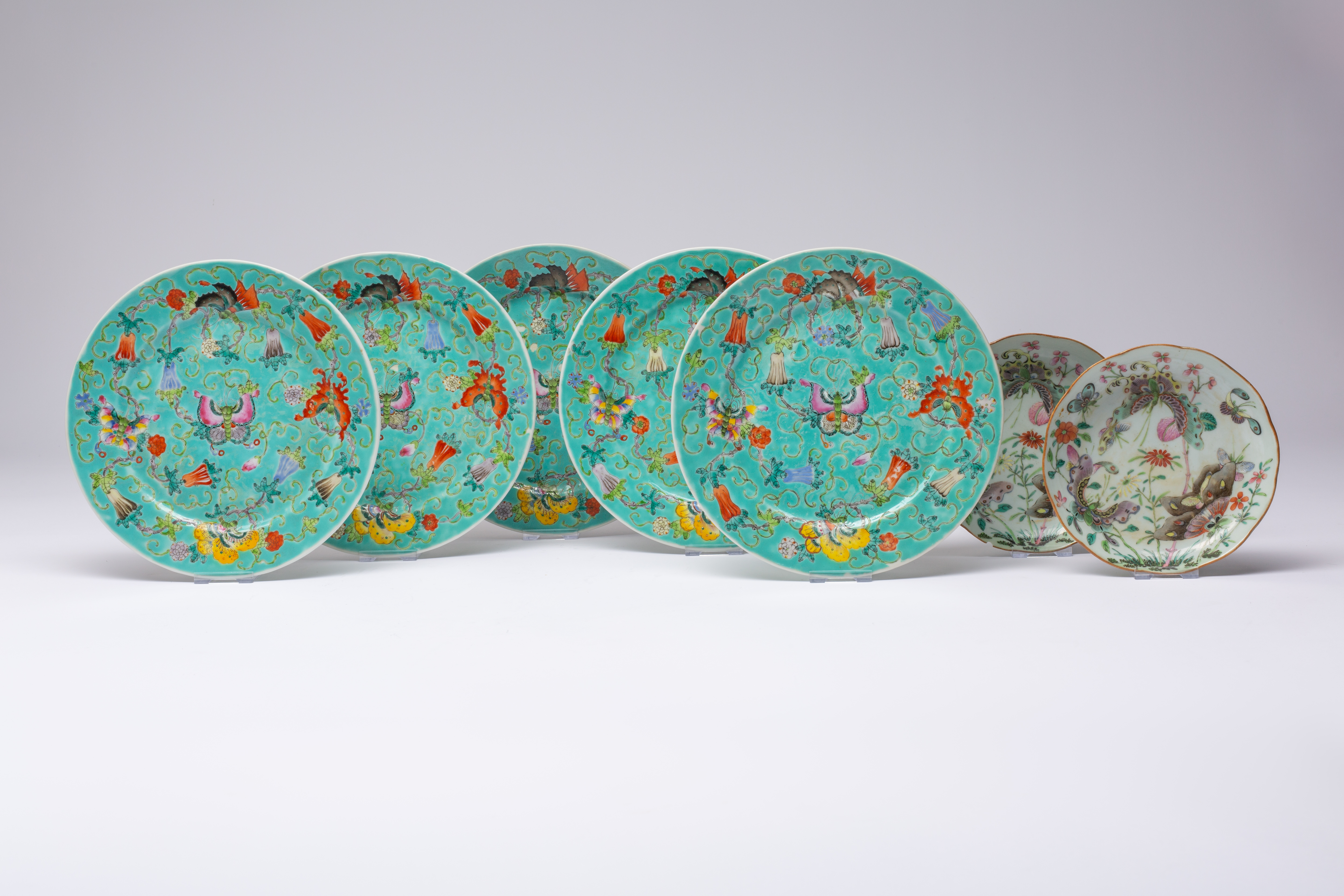 Painted with butterflies and fruiting branches, each with a Guangxu mark; together with two saucers with butterflies amongst floral sprays, with Jiaqing marks to the bases, 21.8cm max. (7)