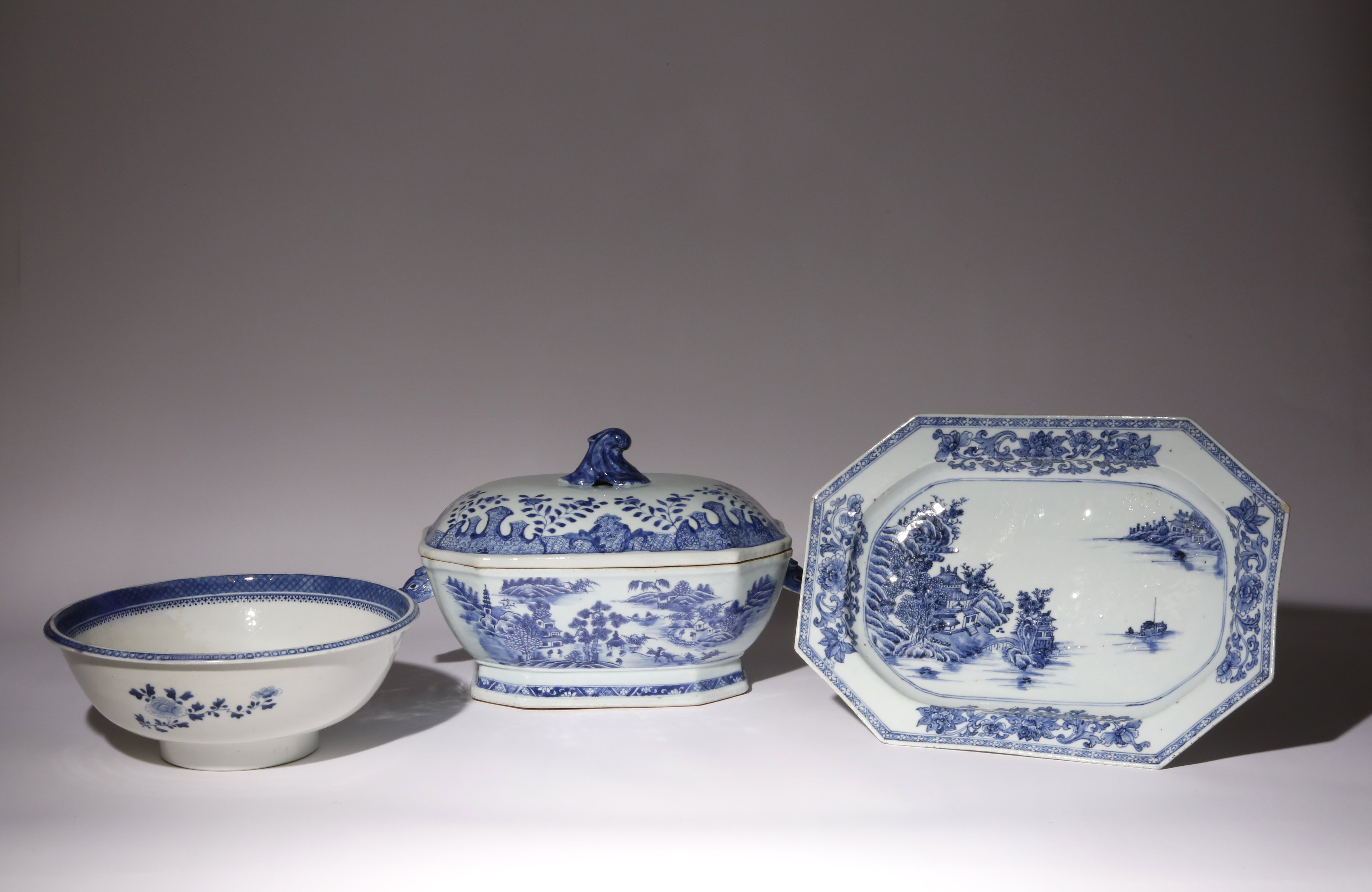 A CHINESE TUREEN AND COVER TOGETHER WITH A DISH AND A BOWL
