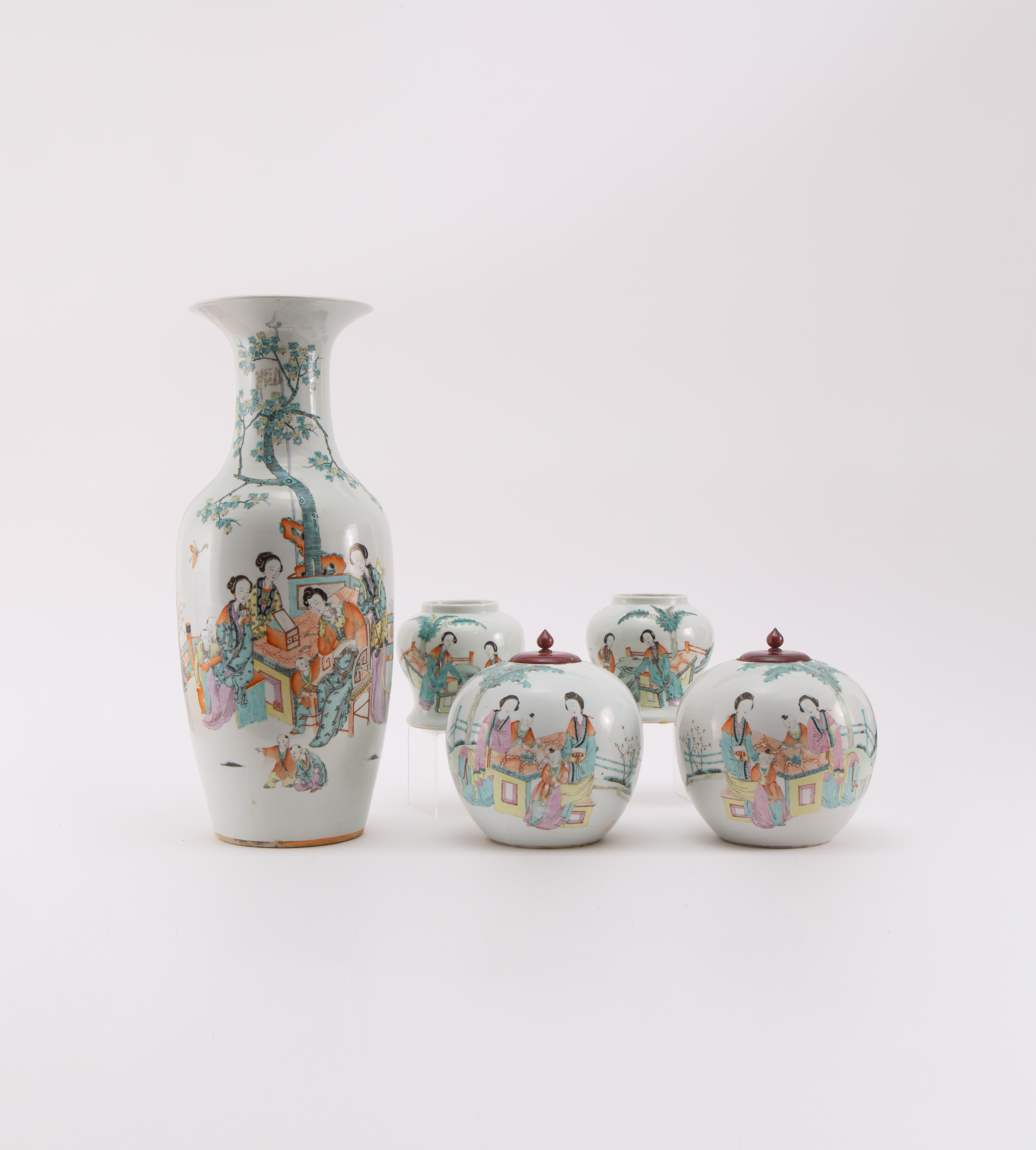 Comprising: a baluster vase and four jars, each decorated with beauties and children in a fenced garden, the reverse with calligraphic inscriptions, with two wood covers, 58cm max. (7)