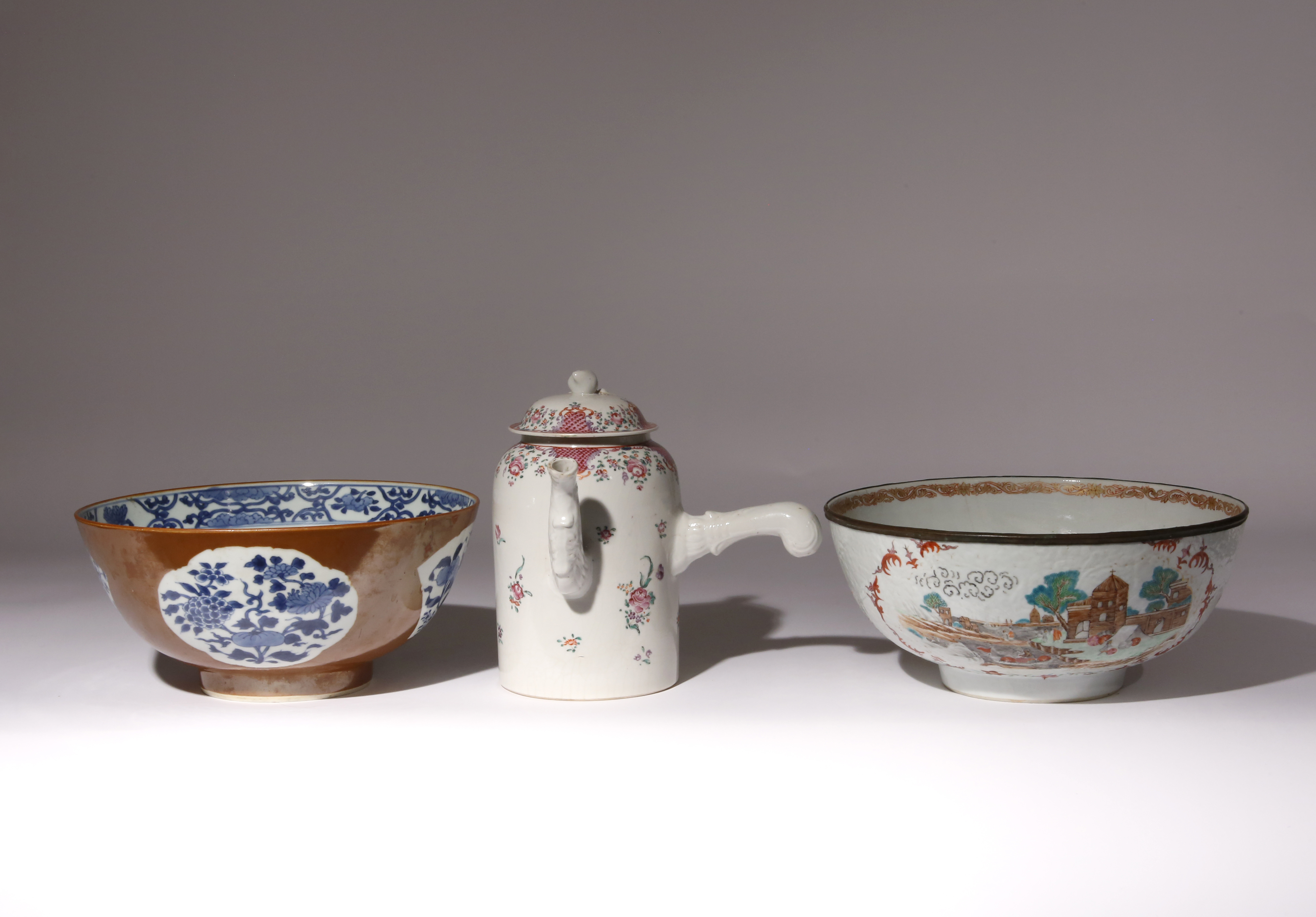 Comprising: an underglaze blue and cafe-au-lait ground bowl, a famille rose bowl decorated in the Meissen style with figures in landscapes, and a famille rose coffee pot with hinged cover, each with a paper label for the Mary & Peter White collection, 26.5cm max. (3)
