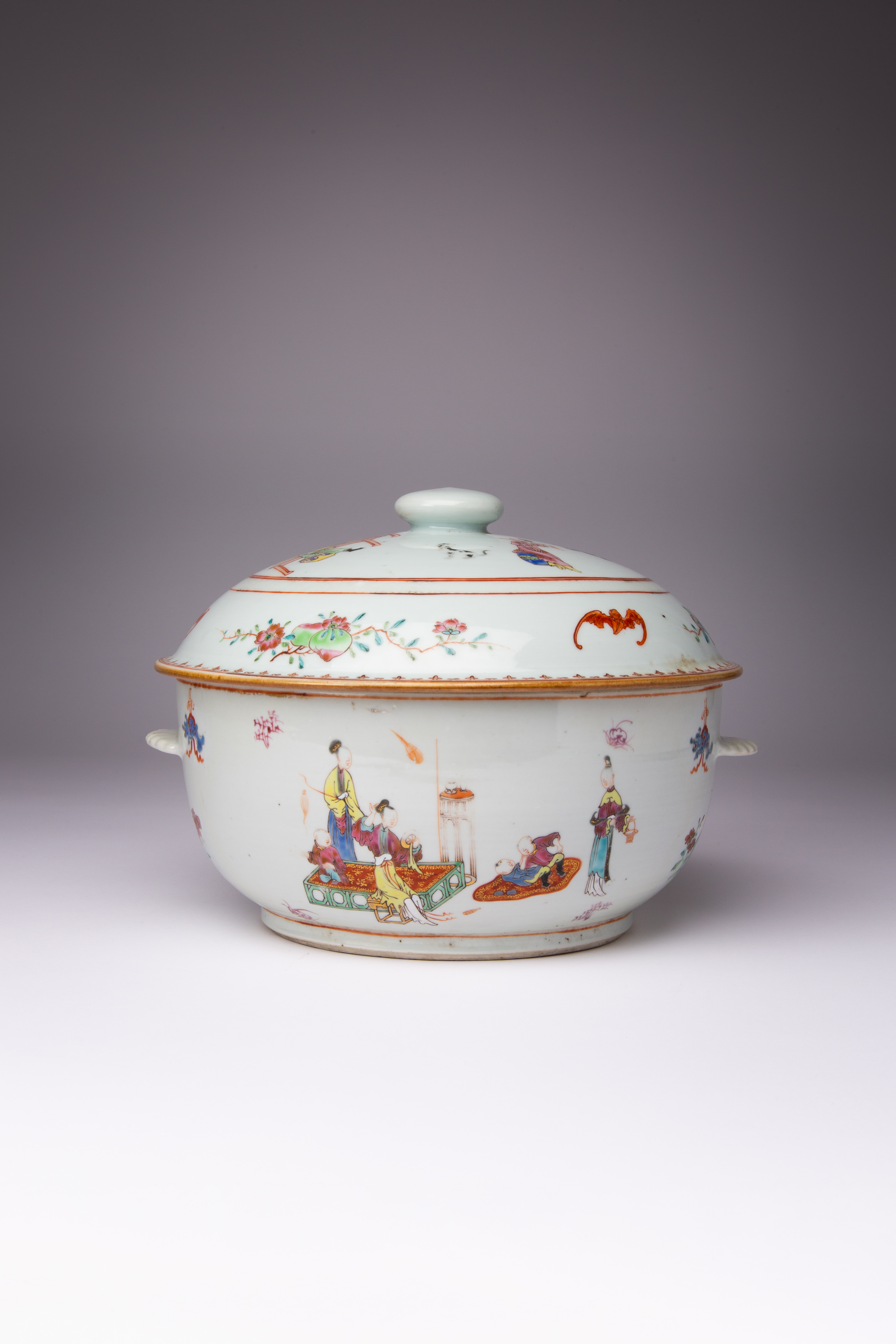 Painted with figures enjoying daily life, the domed cover similarly decorated, with a border of fruiting floral branches and bats, 26cm. (2)