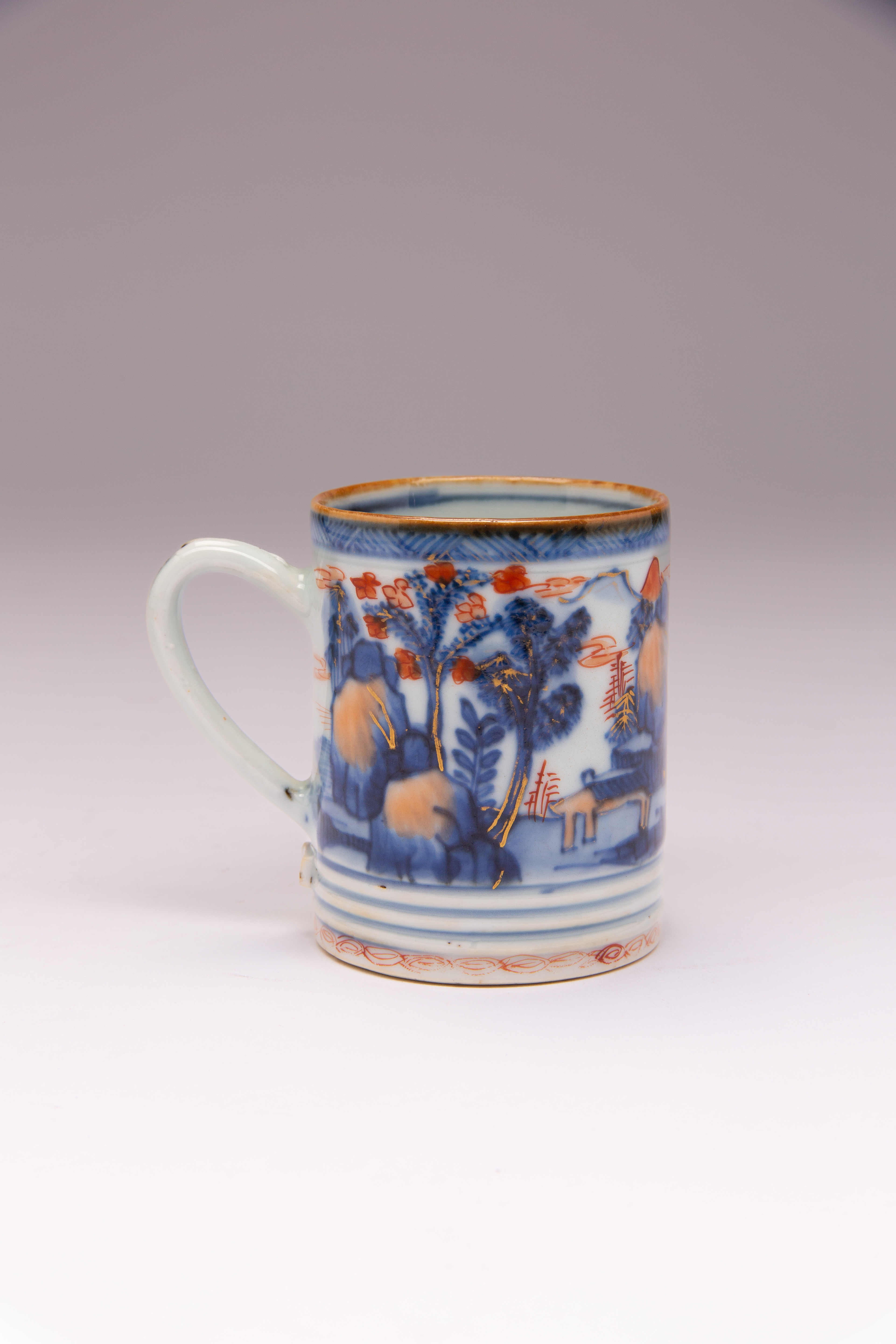 A SMALL CHINESE IMARI 'LANDSCAPE' CYLINDRICAL MUG