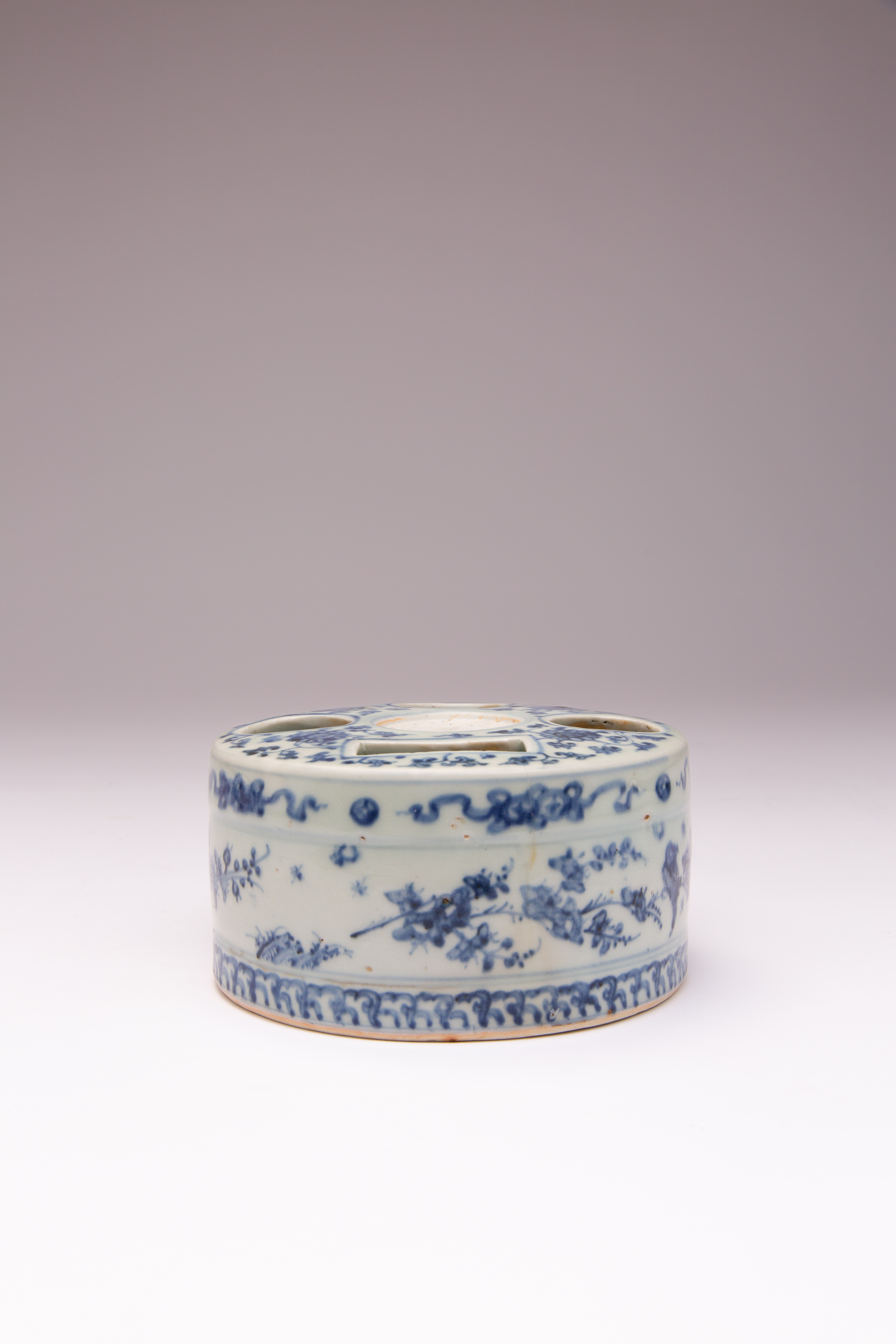 Drum-shaped, the top with three circular and one rectangular apertures separated by scrolling foliage, surrounding an unglazed biscuit circle, the side painted with birds perched on floral branches, the base with a shou shan fu hai mark, 13.5cm.