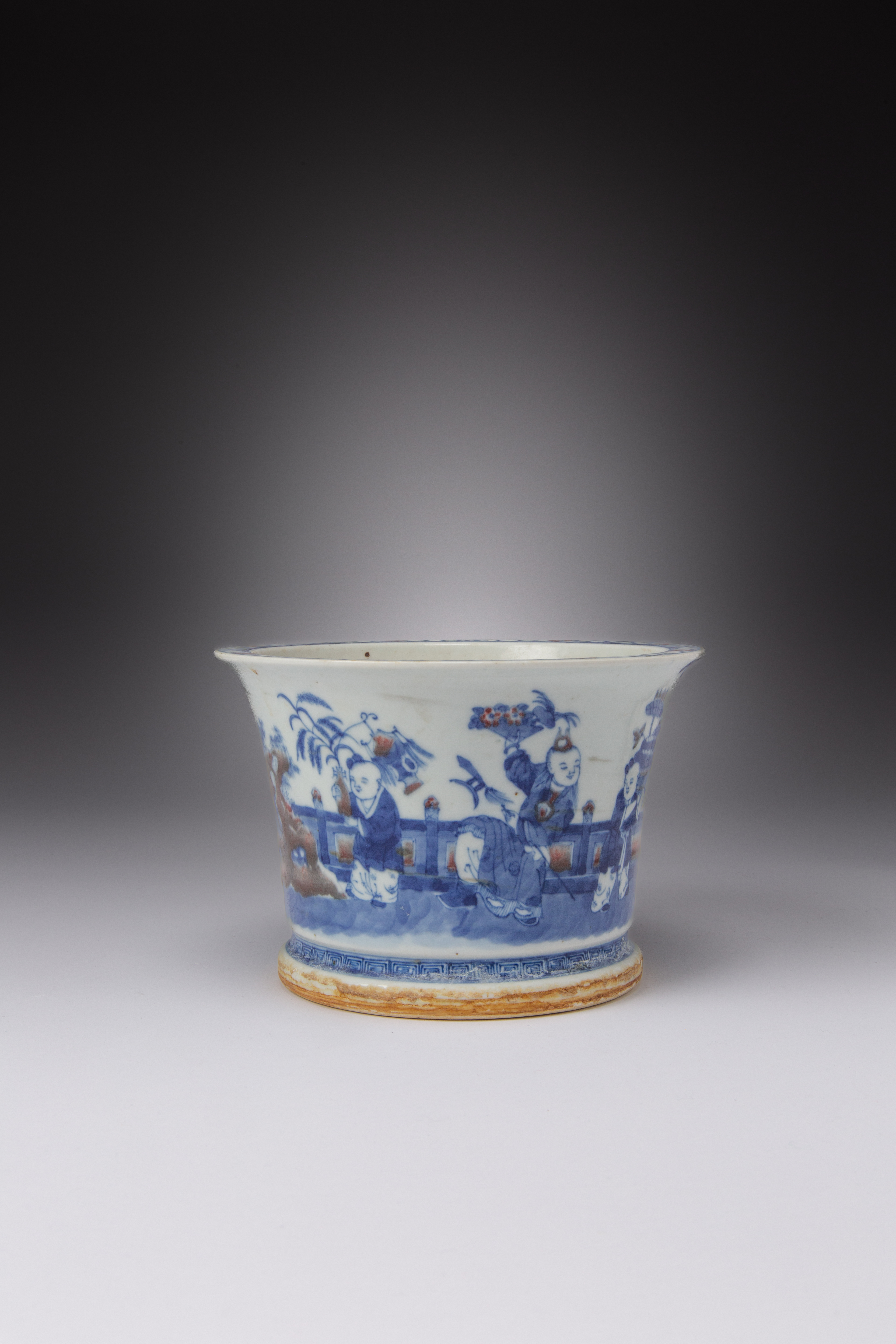 A CHINESE UNDERGLAZE BLUE AND RED 'BOYS' JARDINIERE
