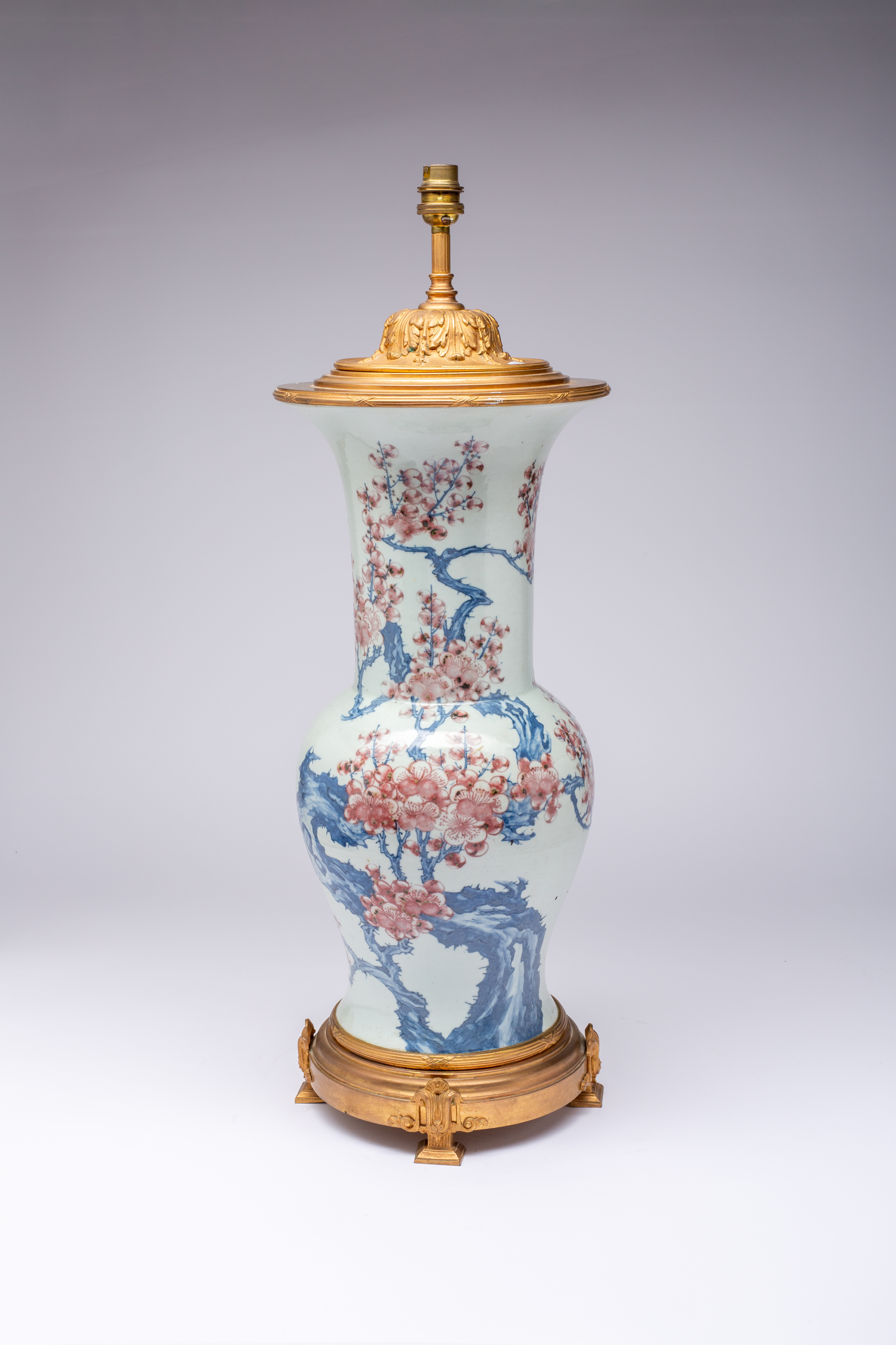 Decorated with twisting gnarled branches of prunus blossoms and buds, mounted with ormolu as a table lamp, 45cm the vase, 67cm overall.
