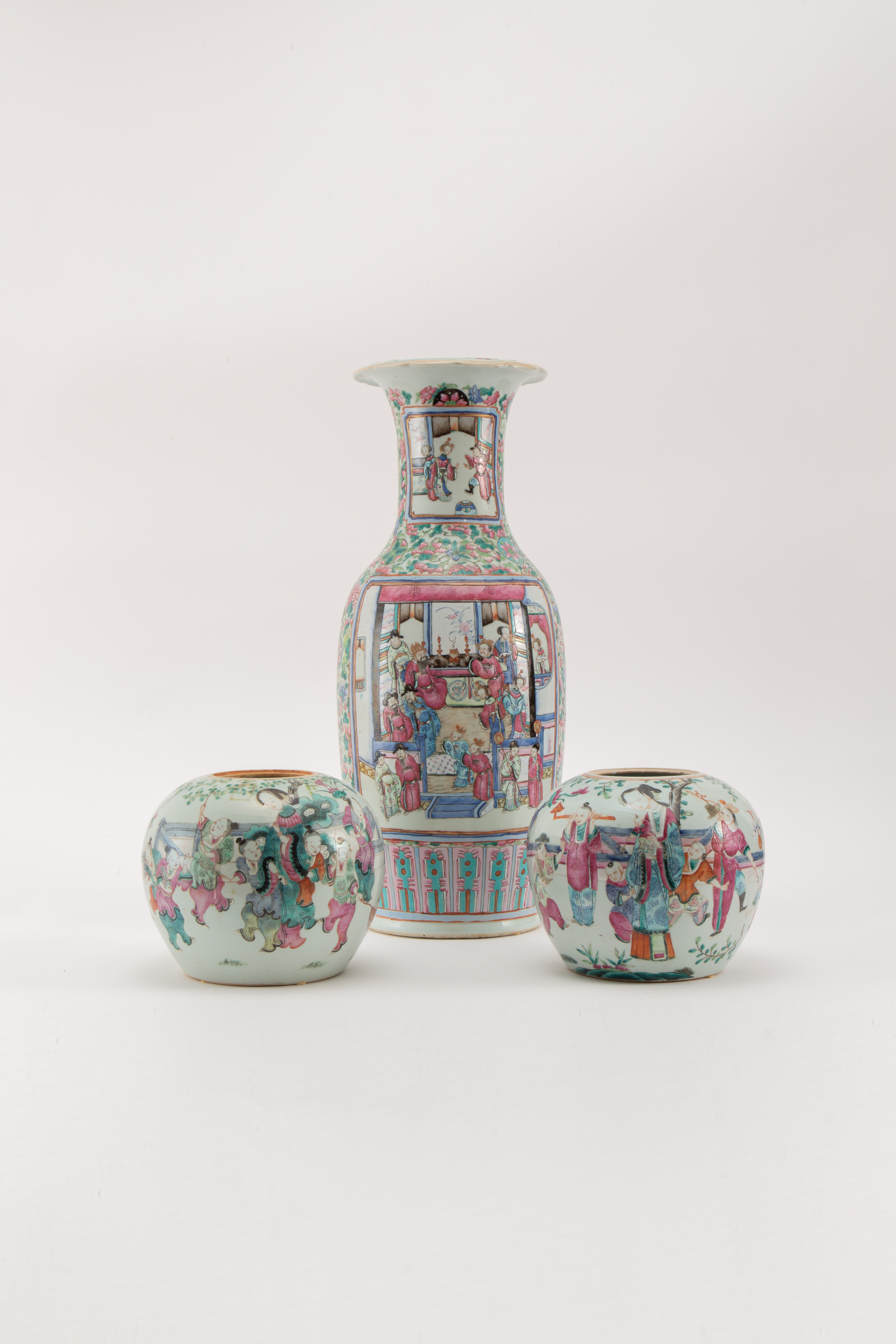 A CHINESE CANTON FAMILLE ROSE VASE AND TWO JARS