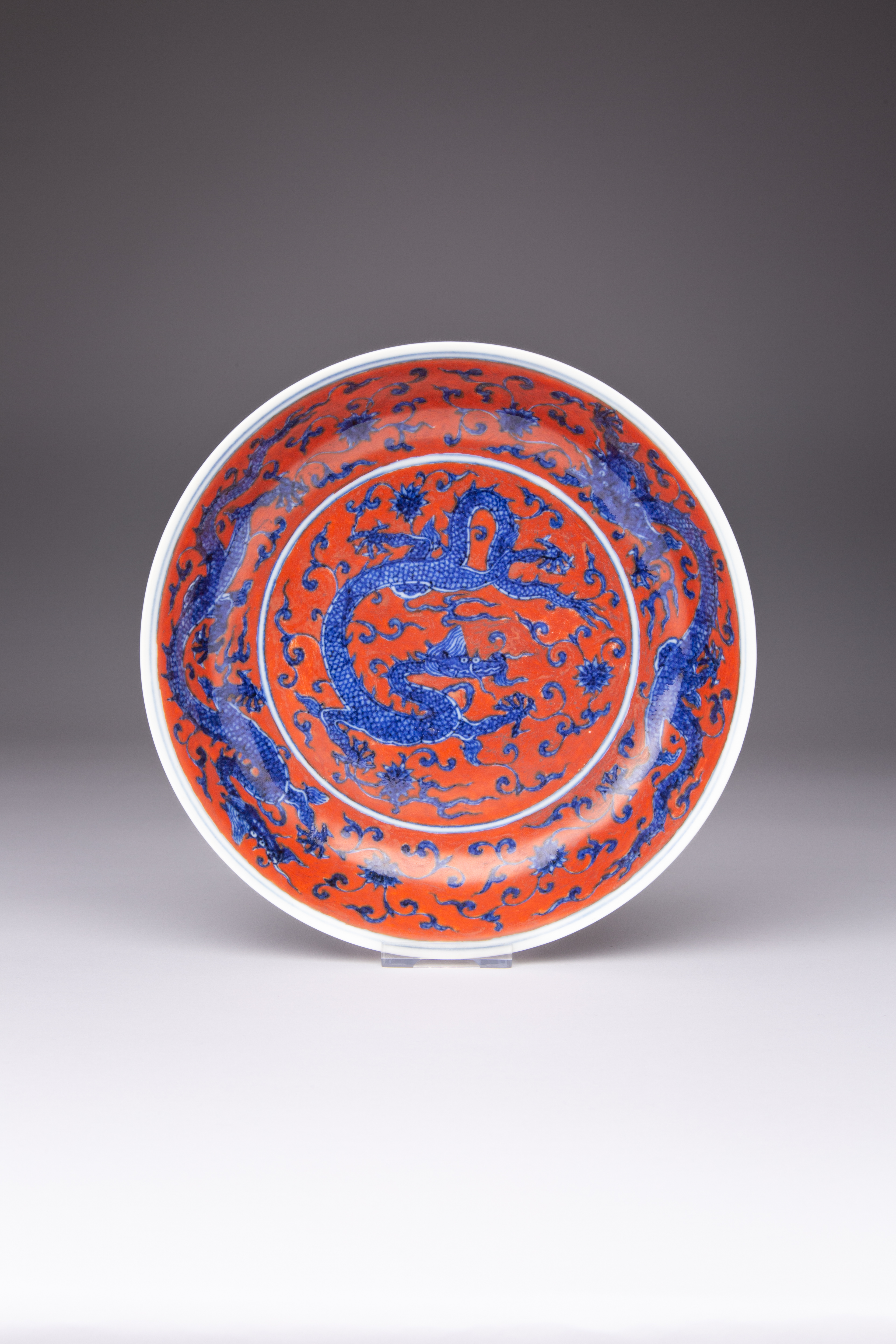 A CHINESE UNDERGLAZE BLUE AND IRON-RED DECORATED 'DRAGON' DISH