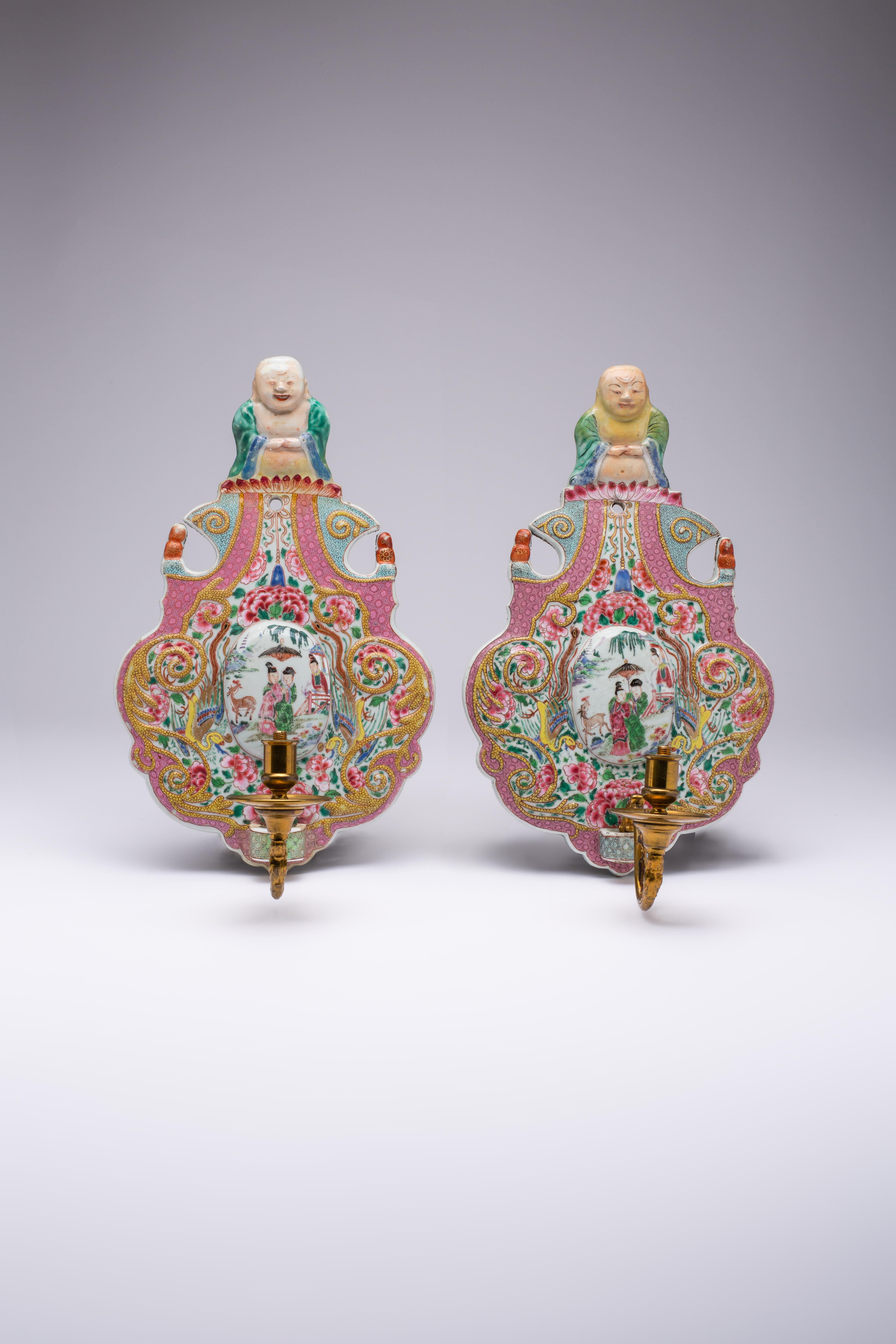 A PAIR OF CHINESE FAMILLE ROSE WALL SCONCES