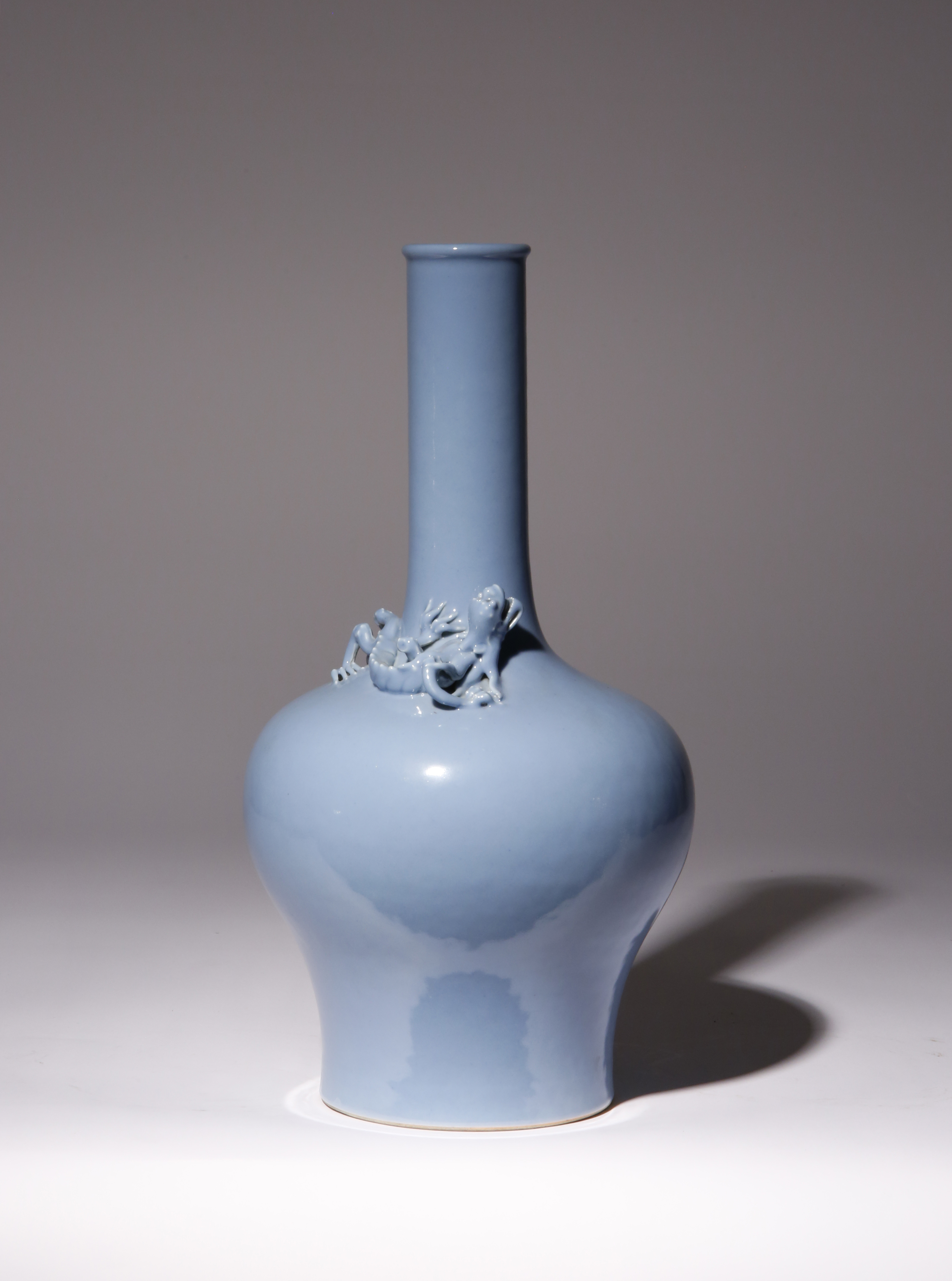 With a tall cylindrical neck and a clambering chilong to the shoulder, covered overall with a pale lavender-blue glaze, the base with a six character Yongzheng mark, 40.5cm.