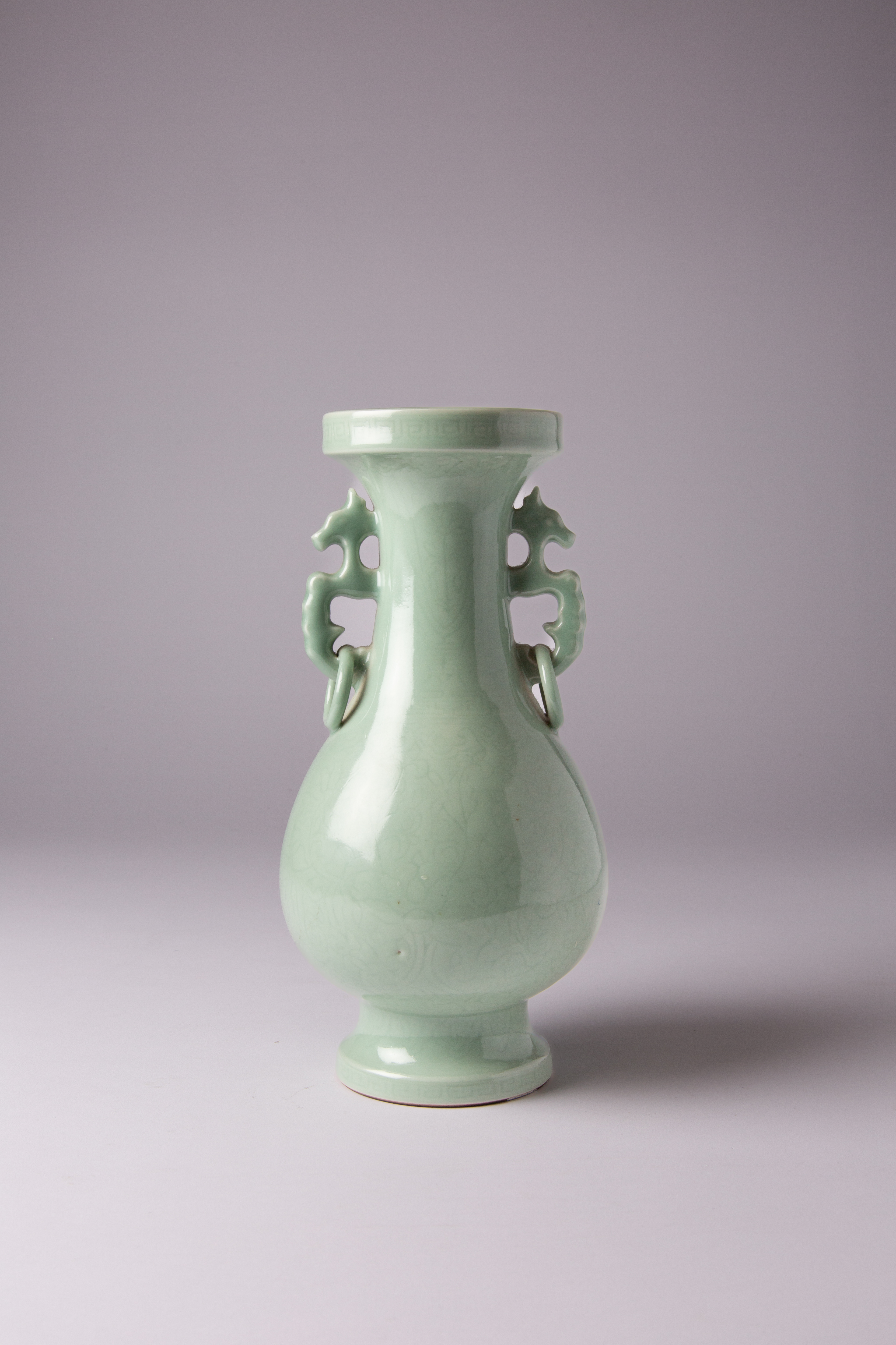 The ovoid body decorated with scrolling lotus, the waisted neck flanked by a pair of kui dragon ring handles, the base with an incised Qianlong mark, 16.8cm.