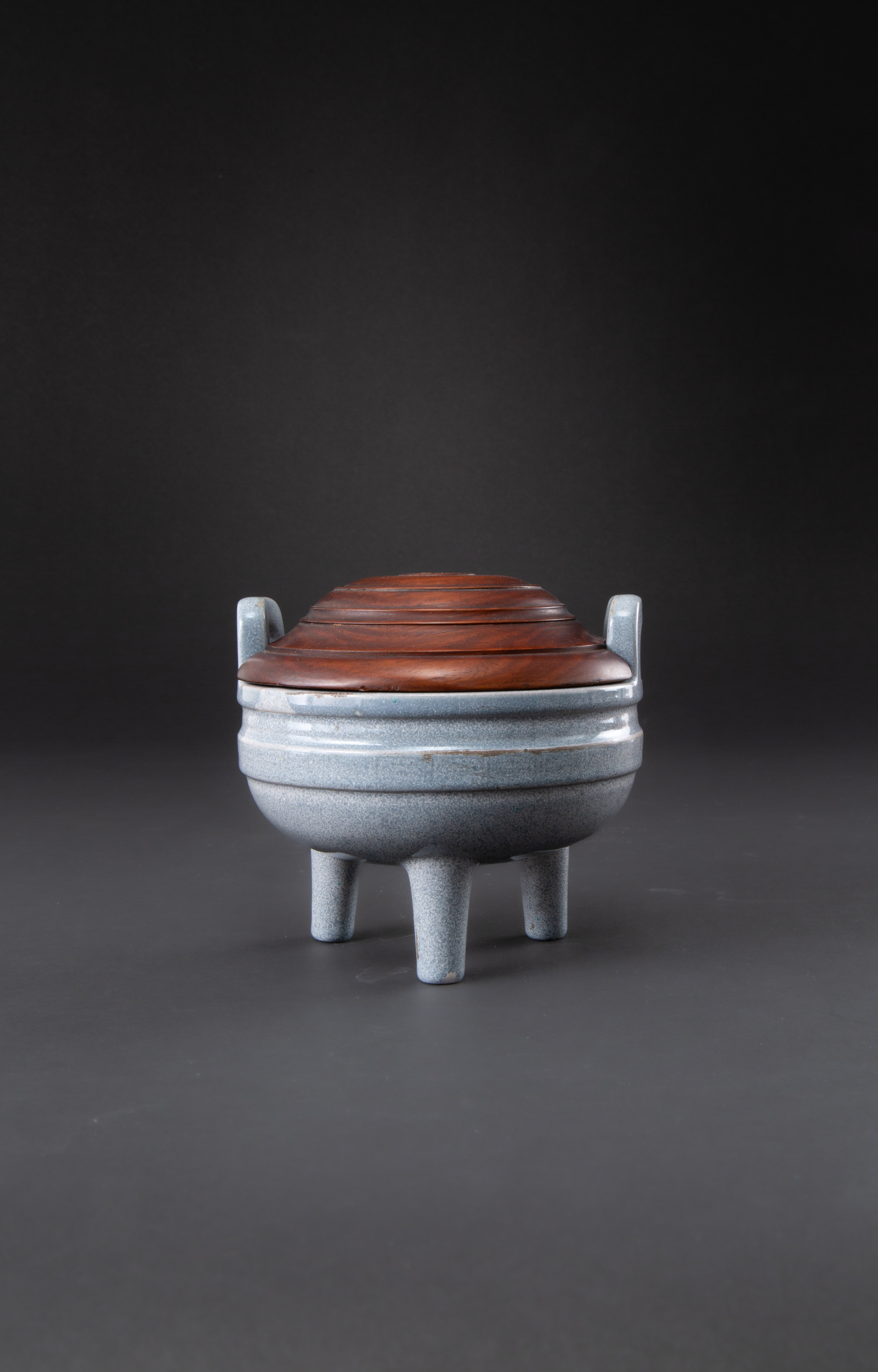 Raised on three conical legs, with a pair of upright handles, the base with an unglazed four character mark reading sheng an fanggu, together with a wood cover, 12.7cm wide. (2)