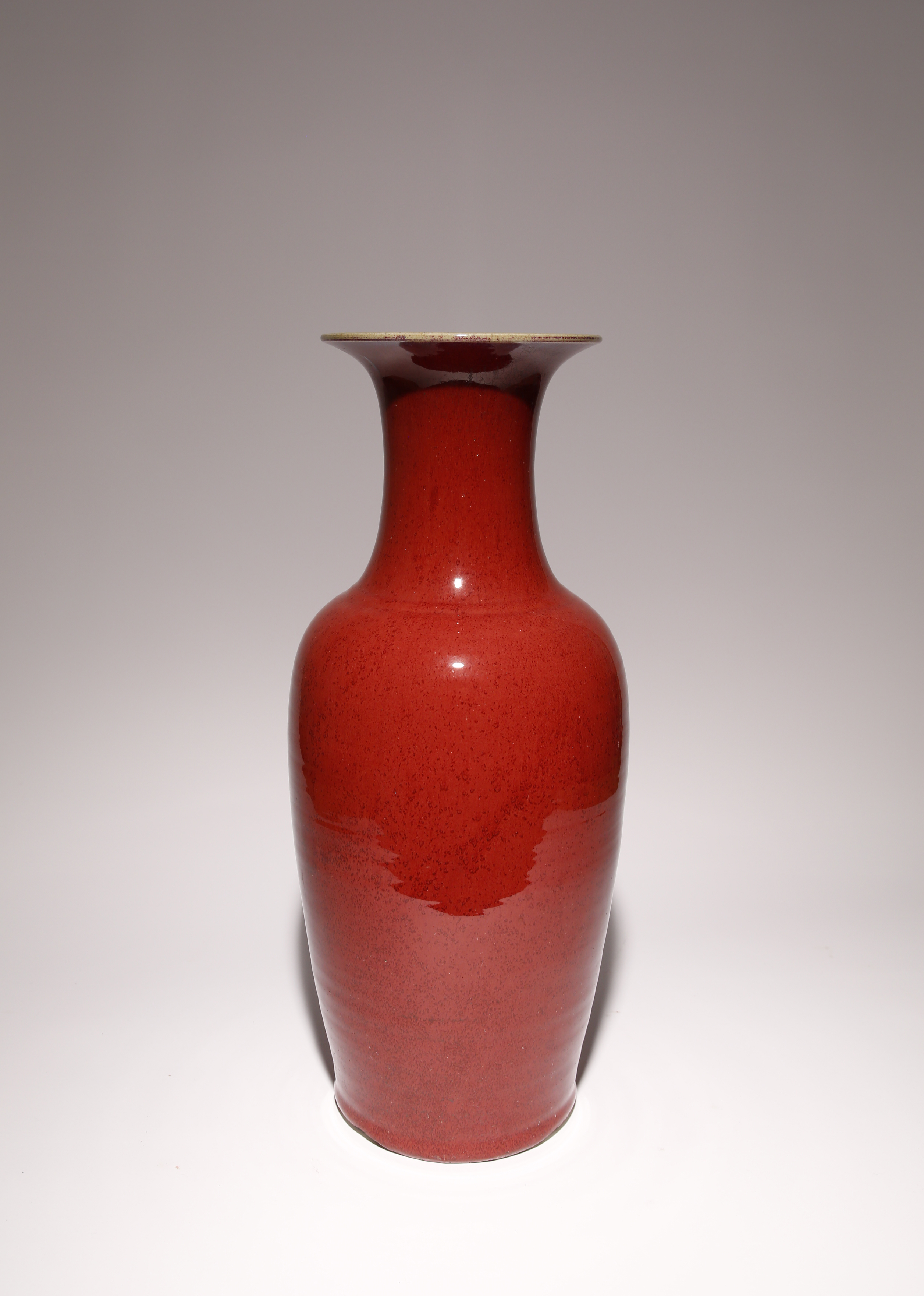 The slender ovoid body tapering slightly towards the foot and surmounted by a waisted neck, decorated with a rich red speckled glaze, thinning to a mushroom tone, with flecks of lavender and violet to the mouth rim, the base with a thin brown glaze, 58.9cm.