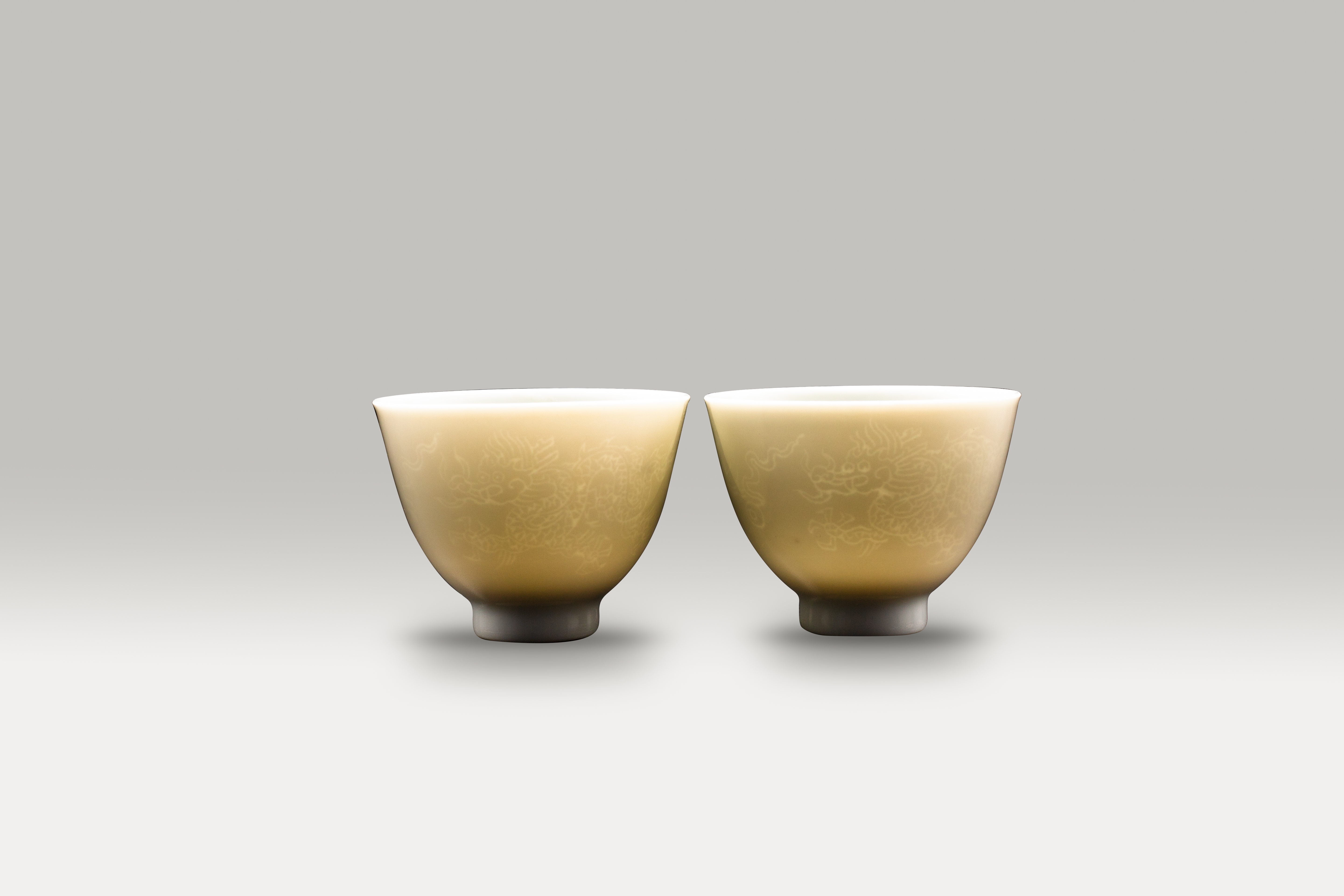 Each incised with two dragons chasing flaming pearls, covered overall in an even greyish-white glaze, each base with a Yongzheng mark, 5.1cm wide. (2)