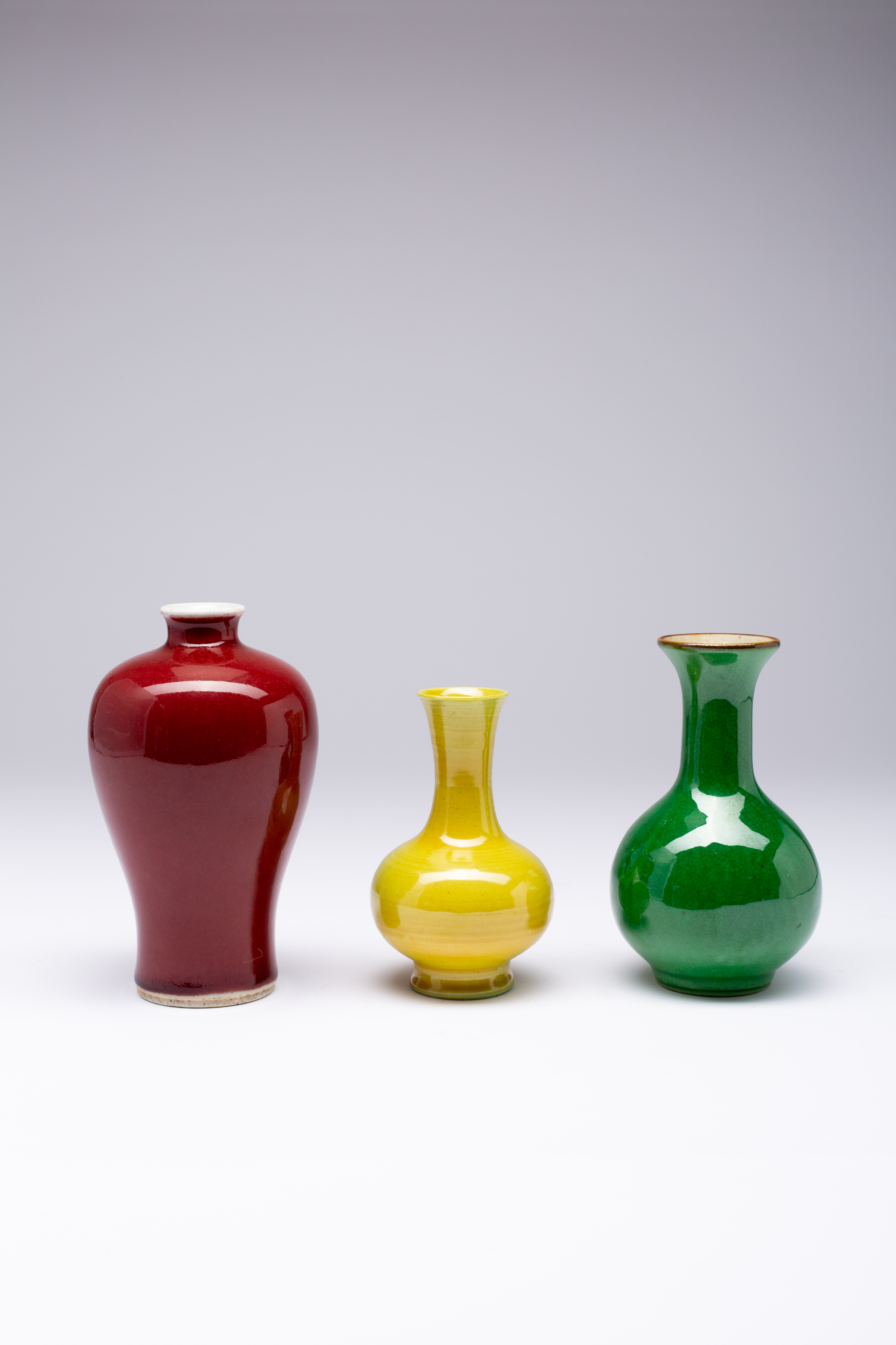 One a meiping with a copper-red glaze, the others with yellow and green glaze, 16cm max. (3)
